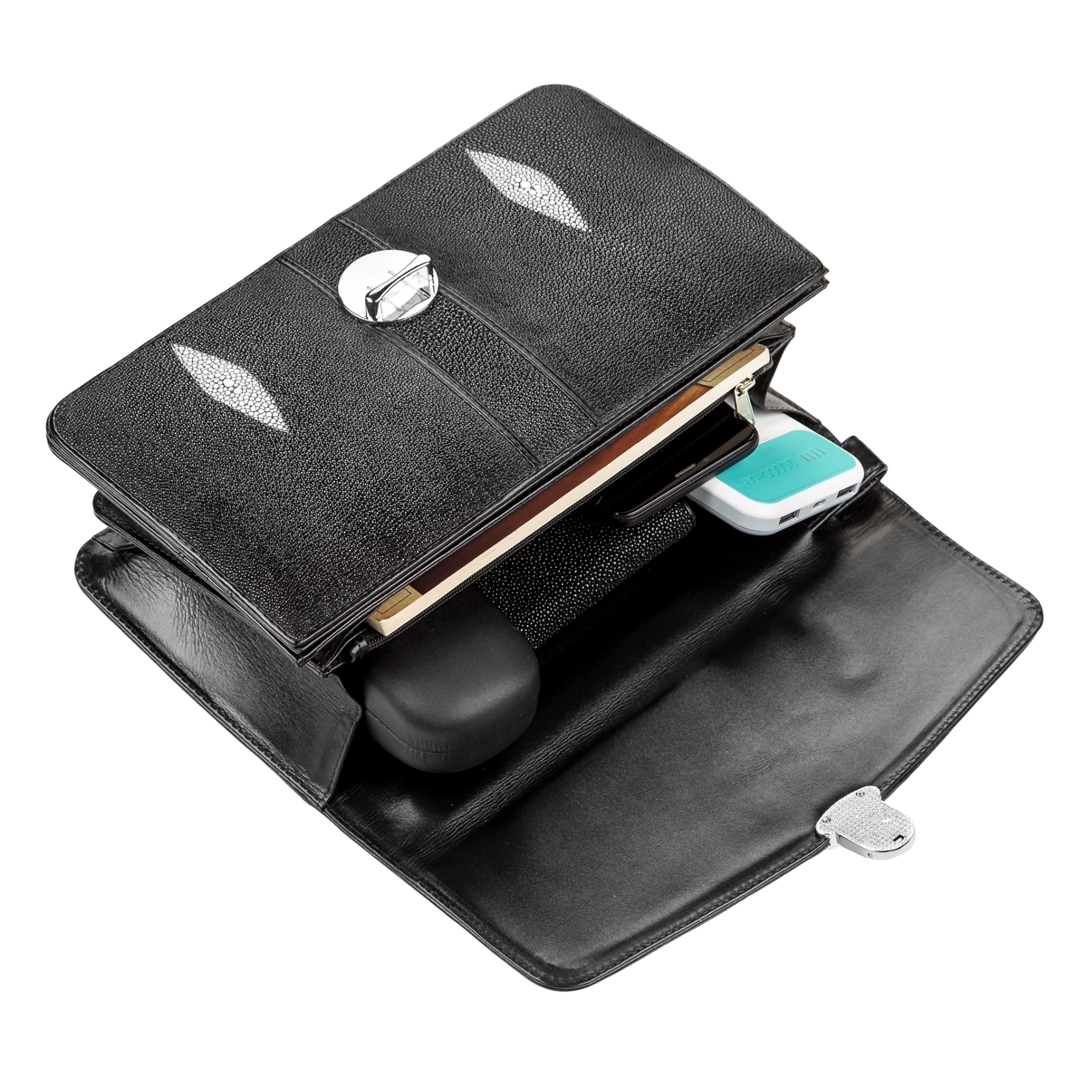 фурнитура, серебряного цвета. Барсетка обшита гладкой кожей