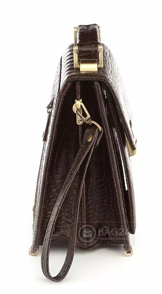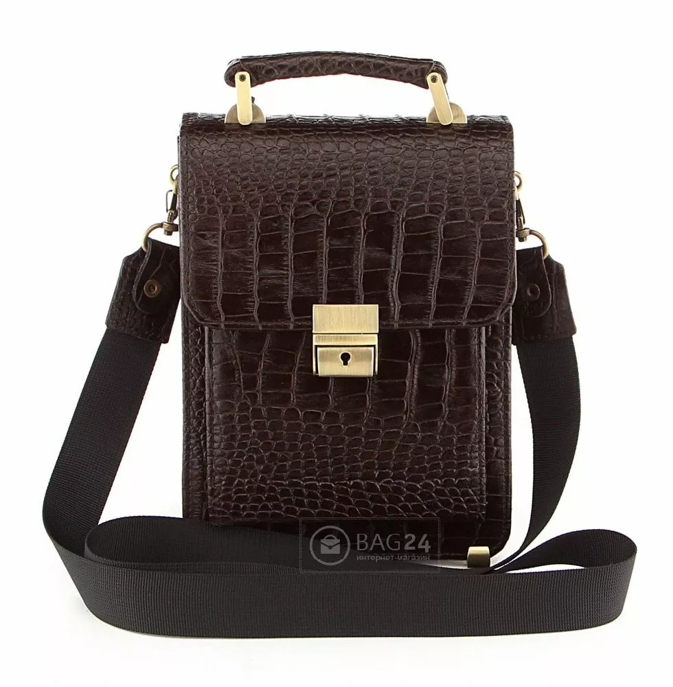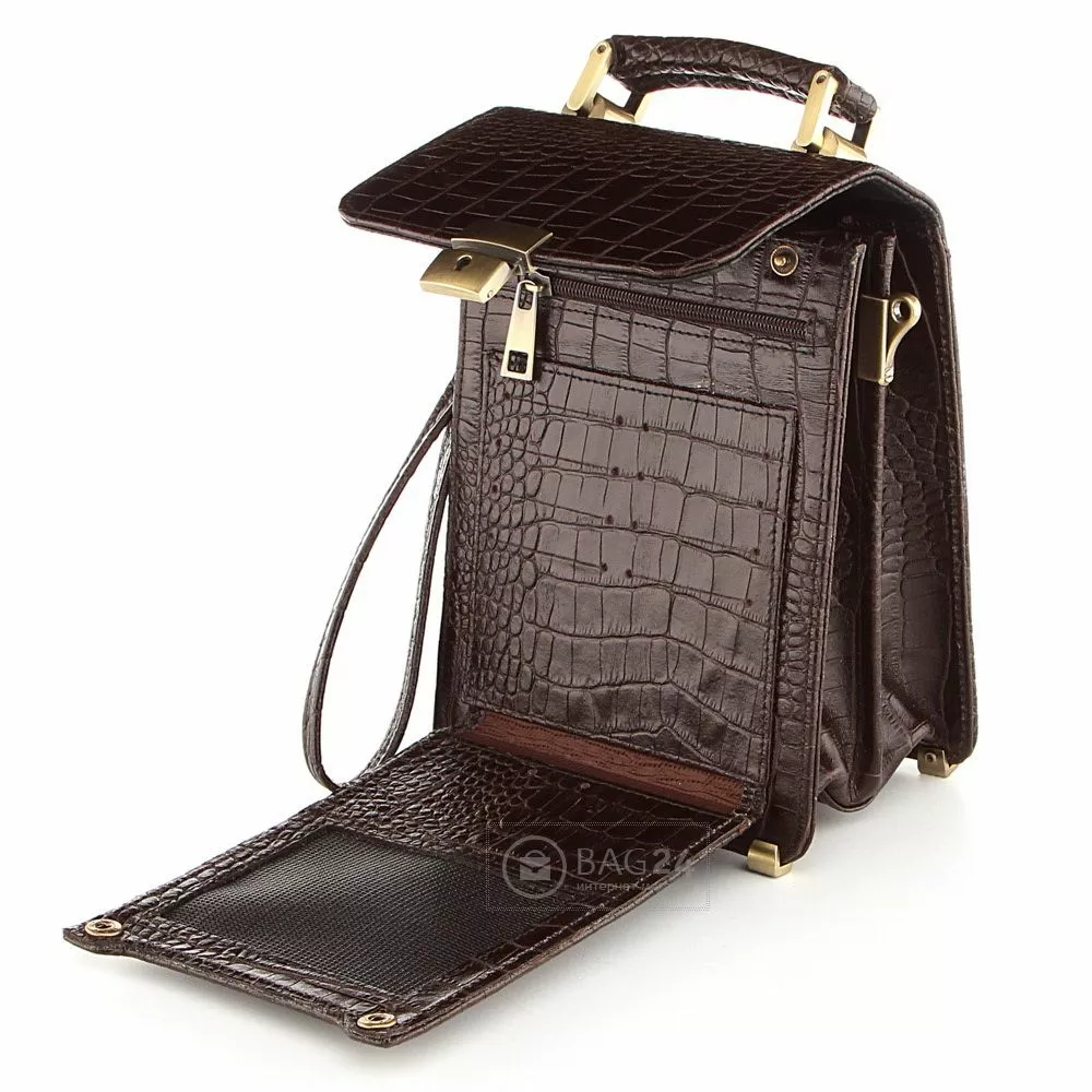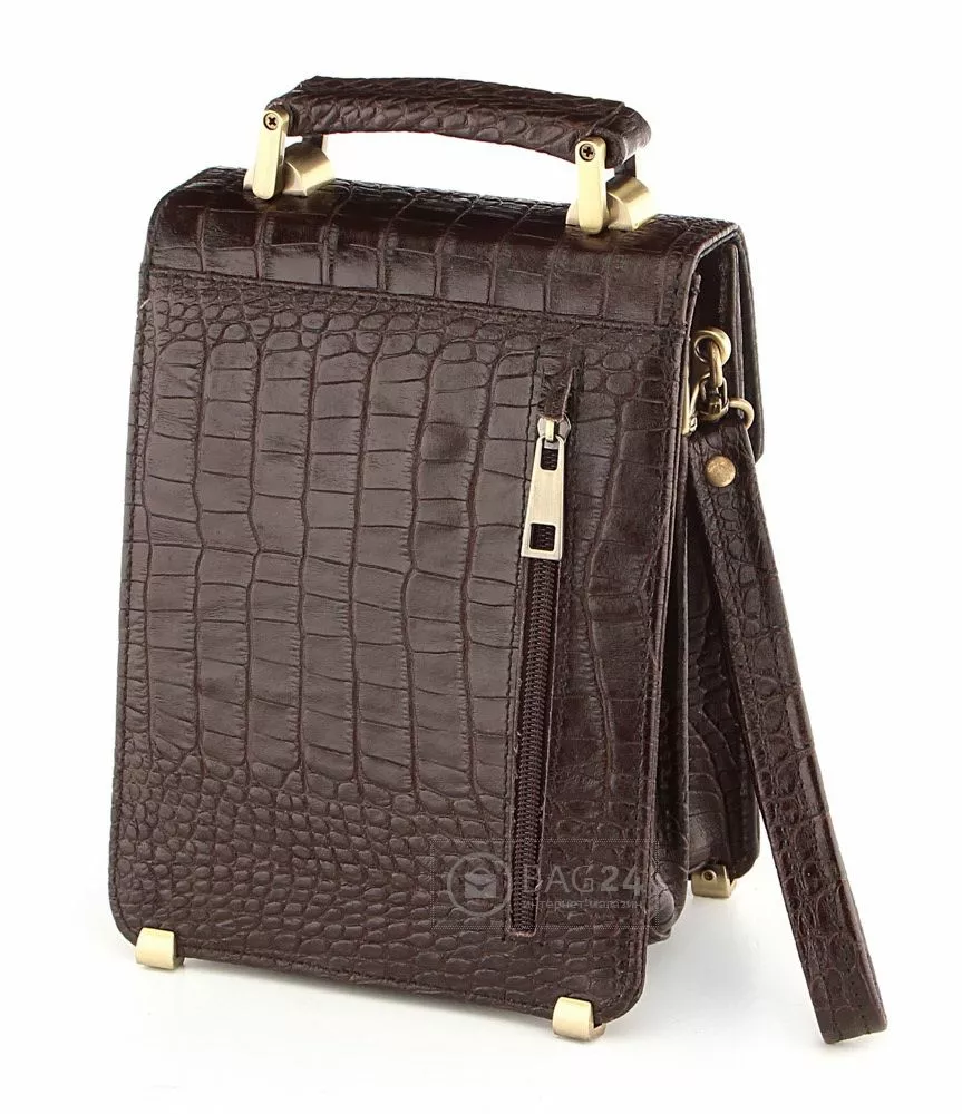 Небольшая кожаная мужская барсетка вертикального формата. Несмотря на свои компактные размеры аксессуар очень вместителен и функционален. Цвет фурнитуры: желтый. В комплекте кроме наплечного ремня, имеется ремень-петля на запястье. На задней внешней стороне находится отделение на молнии.