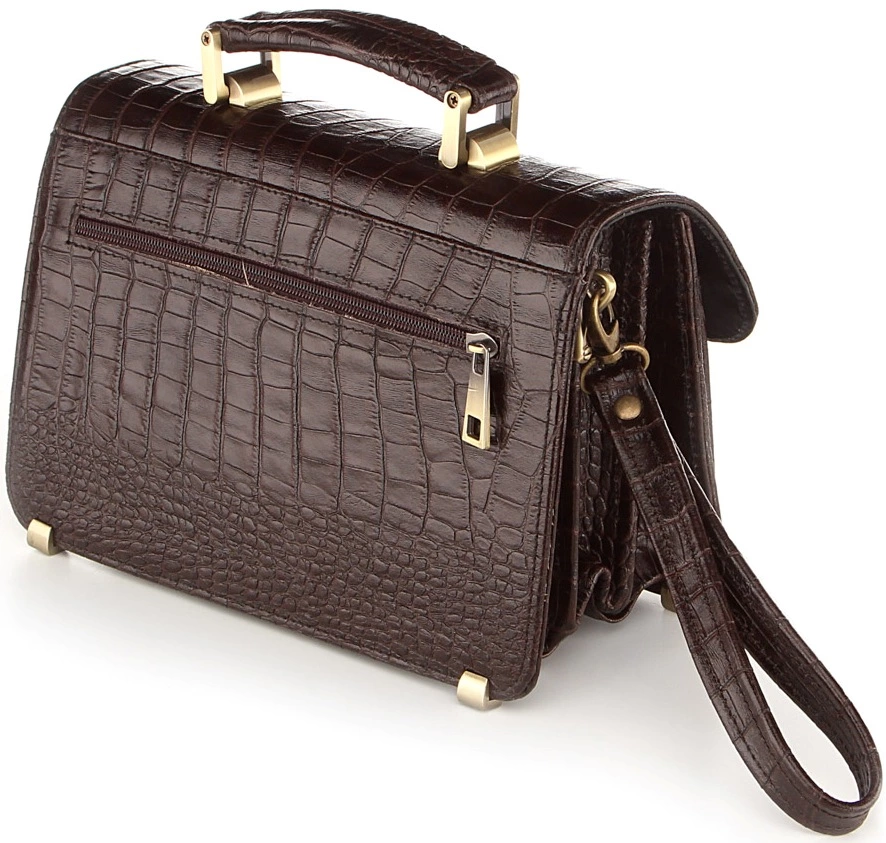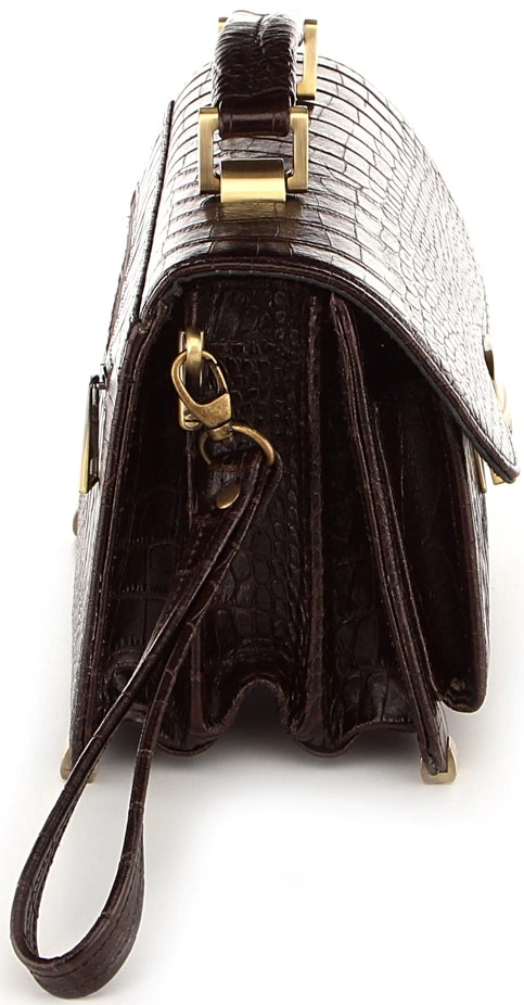 Мужская деловая барсетка средних размеров. Аксессуар выполнен из высококачественной натуральной кожи с фактурой под крокодила коричневого цвета. Цвет фурнитуры: желтый. Такая барсетка обязательно понравится людям, которые предпочитают деловой стиль одежды.