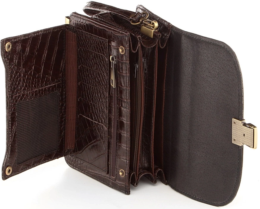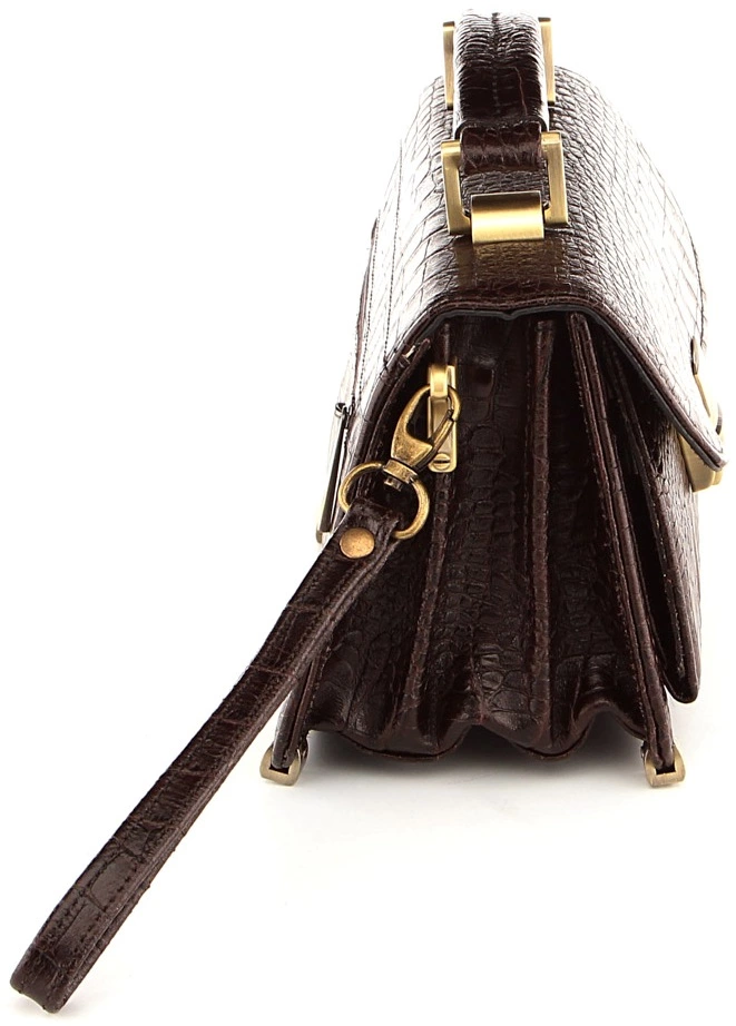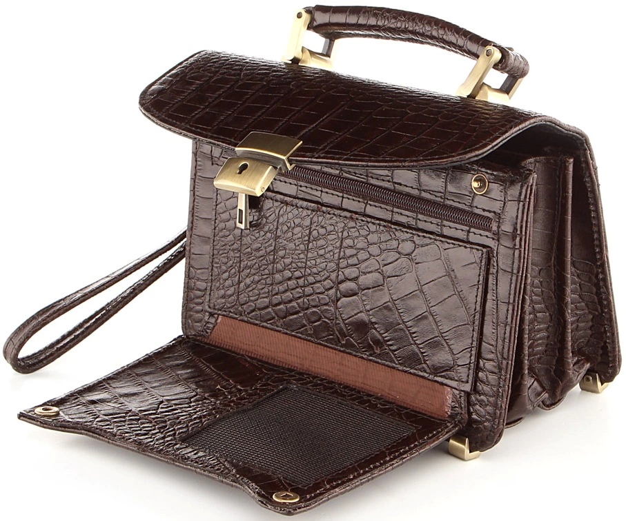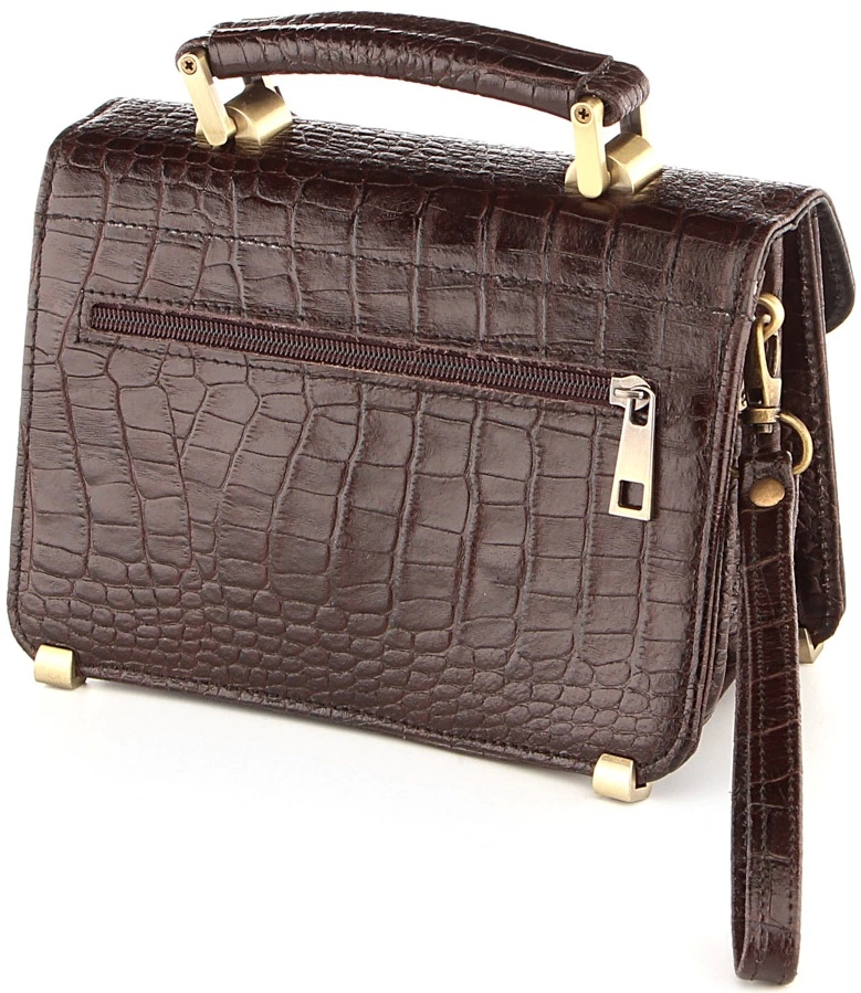 Стильная, компактная барсетка из натуральной кожи с фактурой под крокодила. Несмотря на свои весьма небольшие размеры аксессуар достаточно функционален и вместителен. Цвет фурнитуры: желтый. Такая порсетка обязательно понравится мужчине, которые придерживается делового стиля одежды.