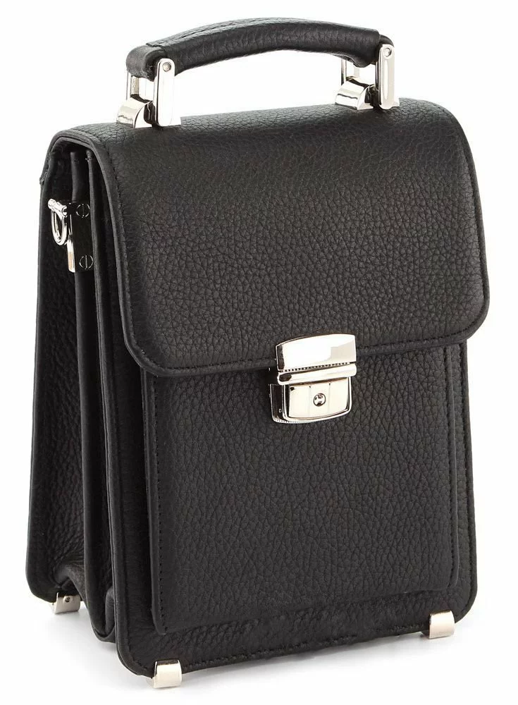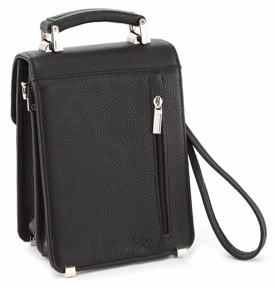 Высококачественная мужская барсетка вертикального формата. Аксессуар выполнен из фактурной (зернистой) натуральной кожи черного цвета. Цвет фурнитуры: серебро. Барсетку можно носить: в руке, на запястье и через плечо. На задней внешней стороне находится отделение на молнии. Дно изделия надежно защищено от повреждений металлическими ножками. При необходимости барсетку можно закрыть на ключ, который имеется в комплекте поставки.