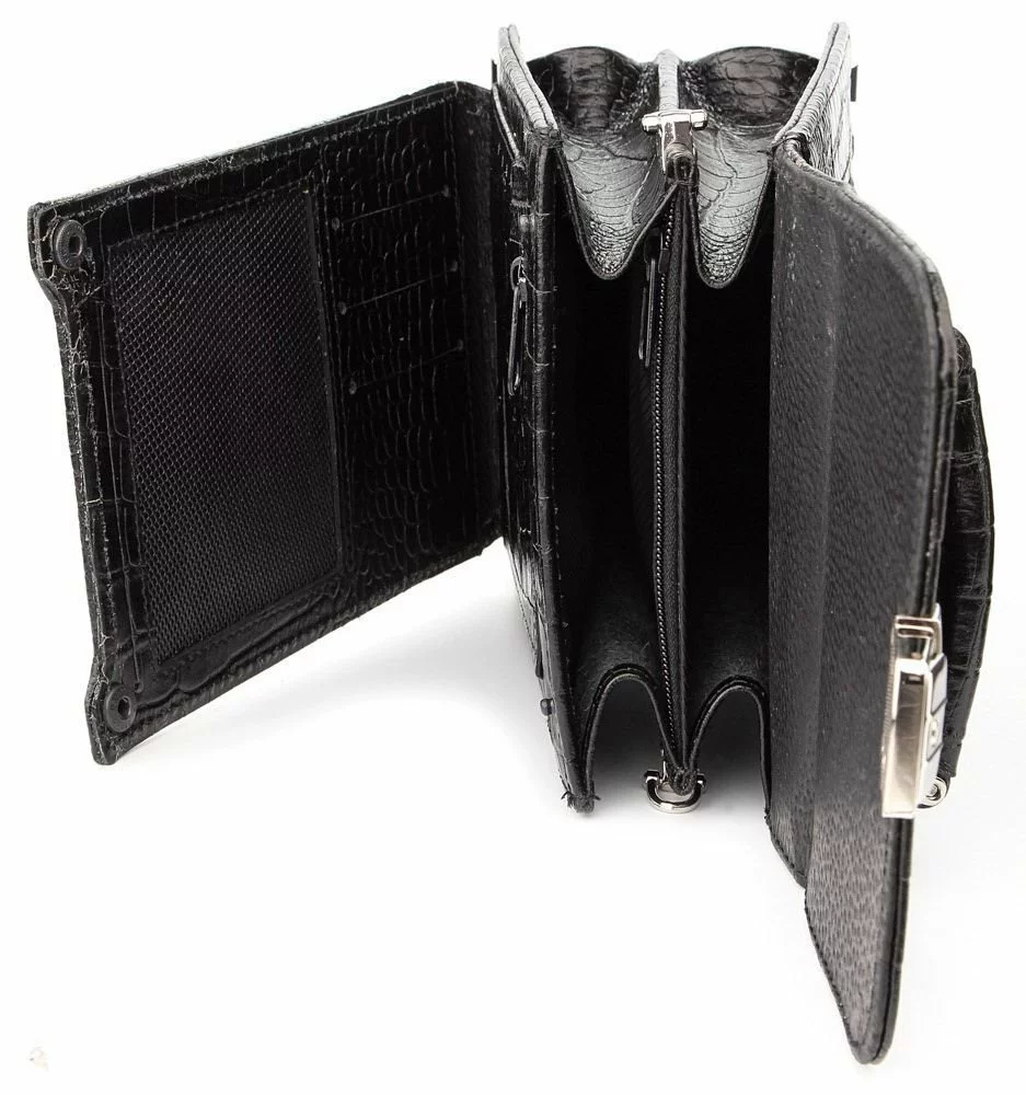 Стильная, удобная и многофункциональная мужская барсетка. Аксессуар выполнен из кожи с фактурой под крокодила, изделия из которой очень популярны в этом году. Данную модель можно переносить в руке, на запястье, а также через плечо. Не мало важным аргументом для покупки данной барсетки является, то что ее можно закрывать на замок (ключ прилагается). Металлические ножки на дне защищают аксессуар от нежелательных царапин.