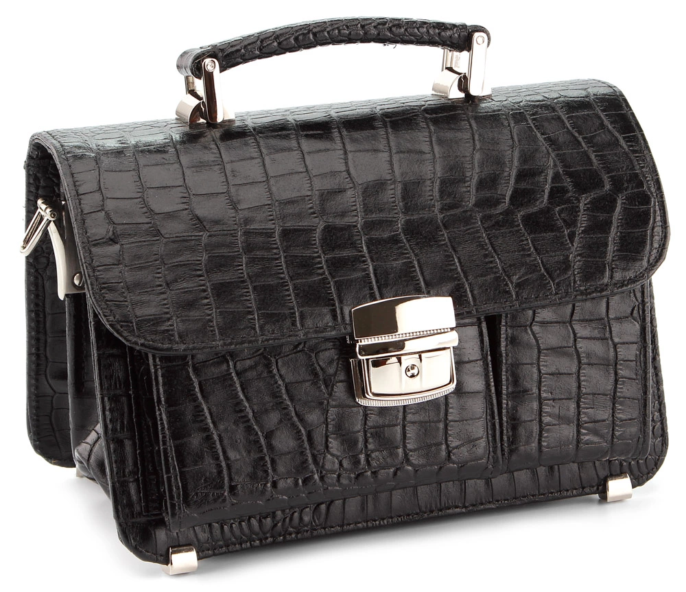 Добротная, современная мужская барсетка. Аксессуар выполнен из натуральной кожи с фактурой под крокодила. Изделия из такой кожи чрезвычайно популярны в этом году. Цвет фурнитуры: серебро. На задней внешней стороне аксессуара расположено отделение на молнии.