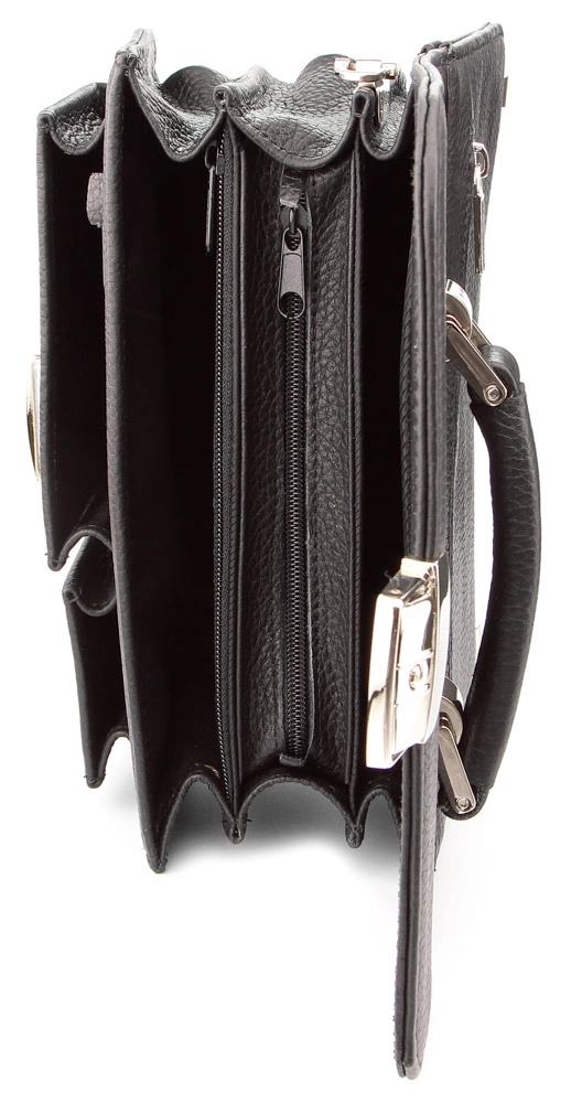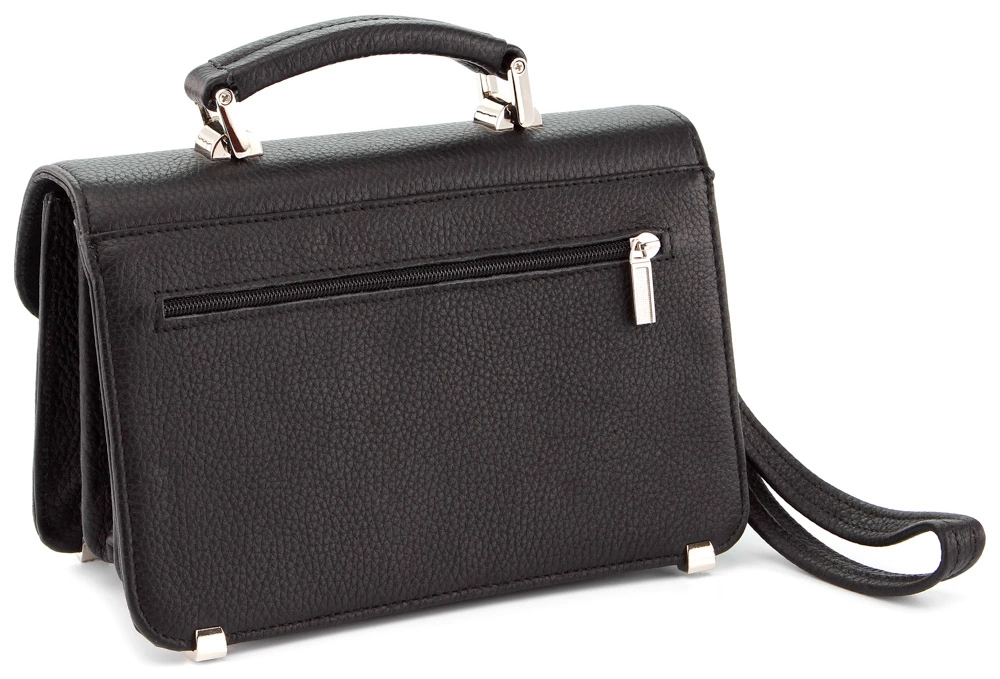 Удобная кожаная мужская барсетка средних размеров. Аксессуар выполнен в черном цветовом решении из кожи флотар. Барсетка закрывается при помощи защелки, которая в свою очередь закрывается на ключ. Носить аксессуар можно в руке, а также на запястье. Цвет фурнитуры: серебро. Дно изделия защищают металлические ножки. Мужская барсетка из натуральной кожи – это отличное решение для подарка мужчине, предпочитающему деловой стиль одежды.