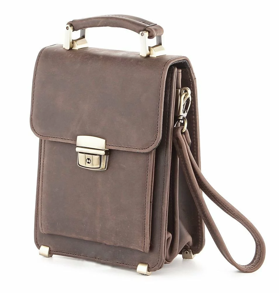 Сверхнадежная мужская барсетка вертикального формата. Аксессуар выполнен из натуральной высококачественной винтажной кожи, изделия из которой чрезвычайно модны и популярны. Данную барсетку можно переносить в руке при помощи удобной кожаной ручки, а также на запястье (в комплекте имеется кожаный ремень-петля). Для защиты содержимого, барсетку можно закрыть на ключ, которым комплектуется данный аксессуар.