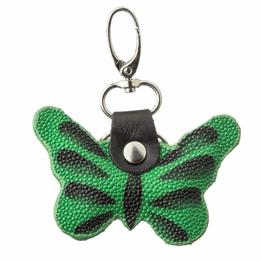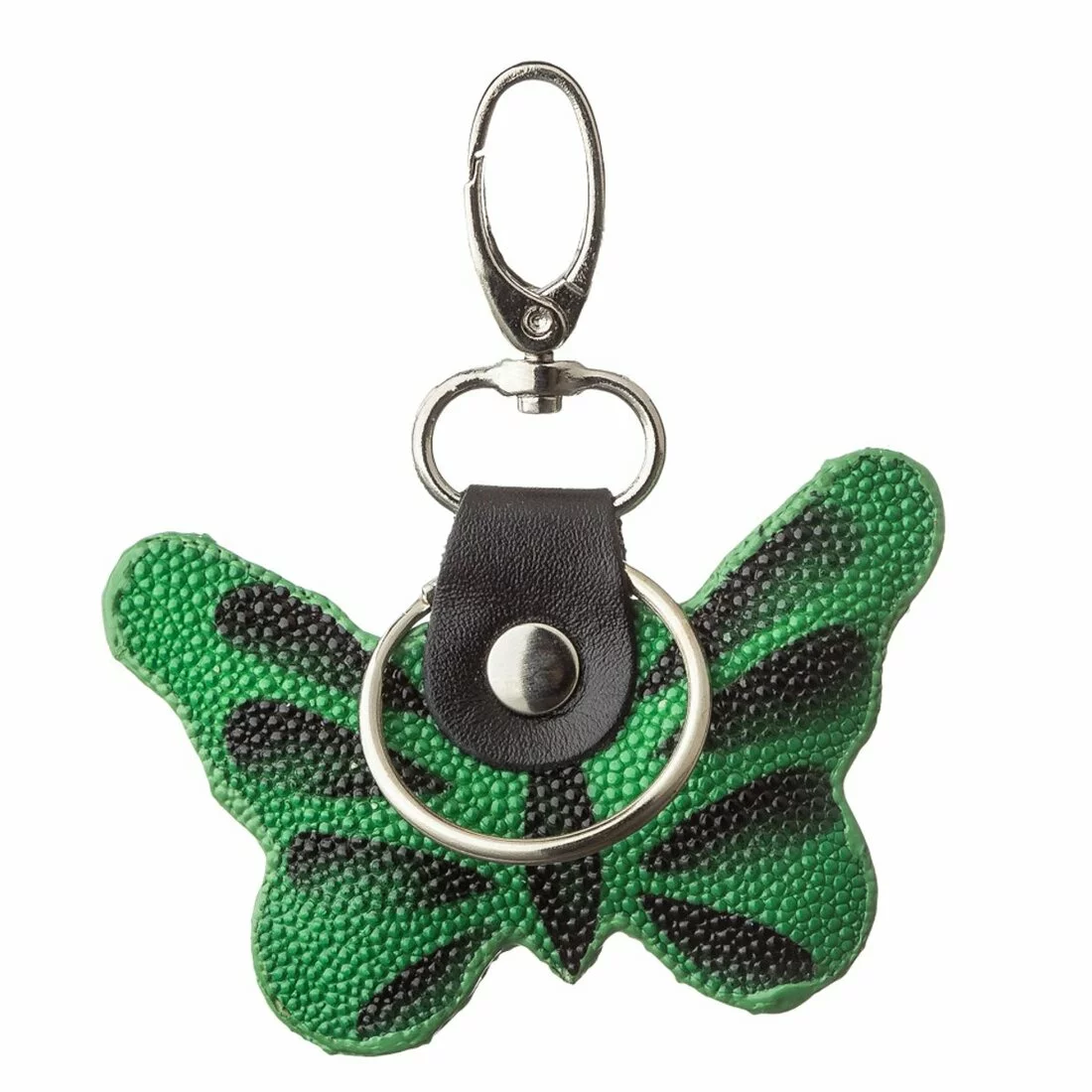 Брелок из натуральной кожи морского ската, очень стойкой к износу, проколам, порезам, к разрывам и даже к огню. Модель в виде бабочки. Изделие подходит как и для ключей, так и как аксессуар для сумочки или рюкзака. Стильный аксессуар на карабине.