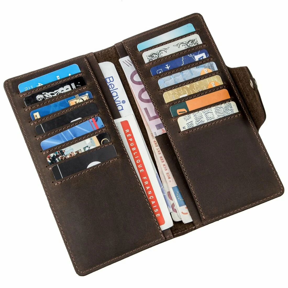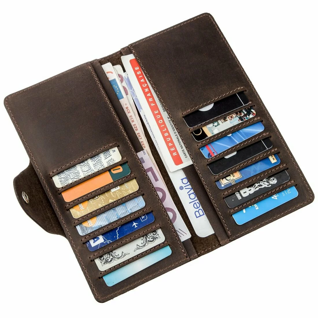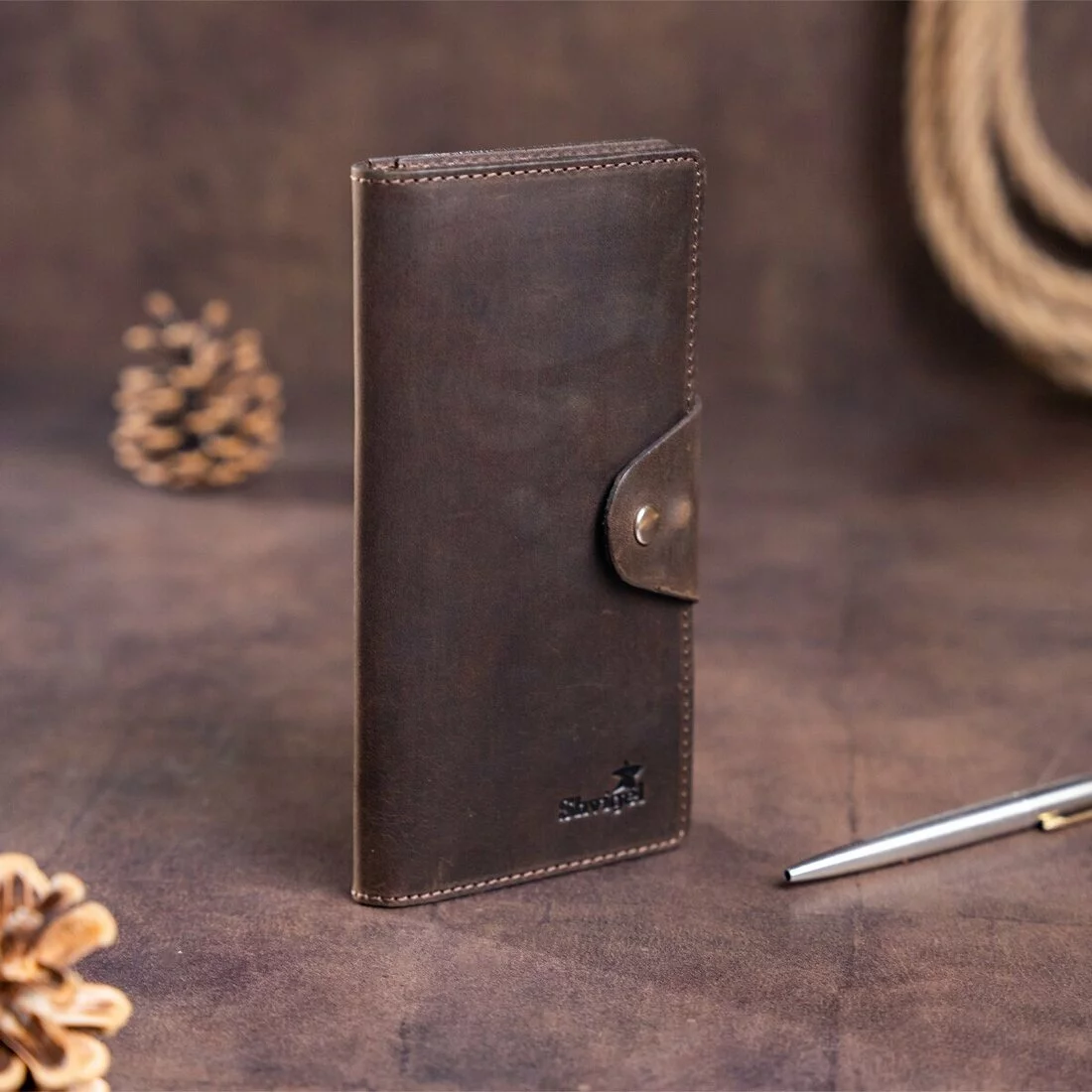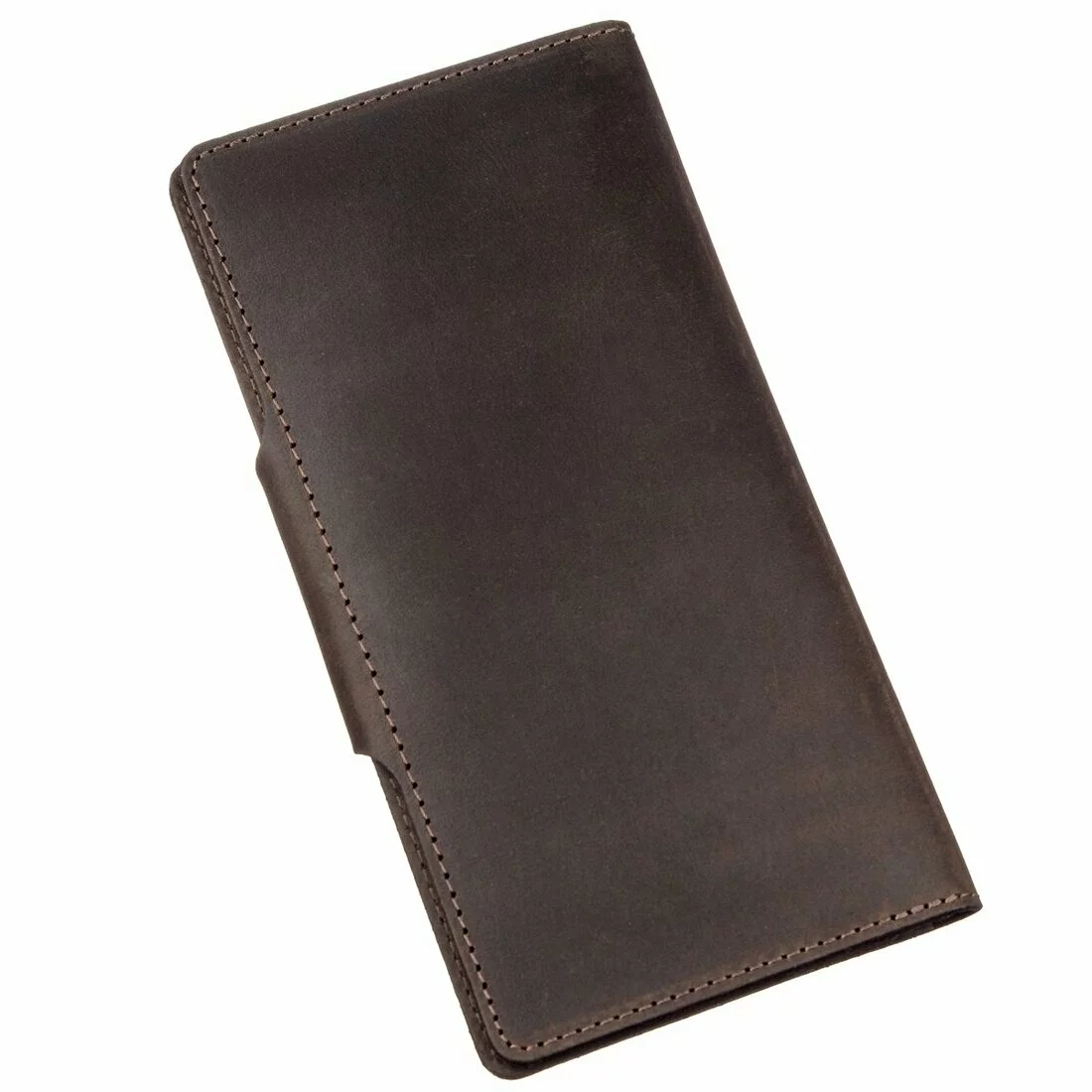 Вертикальный мужской кожаный бумажник с классическим дизайном.