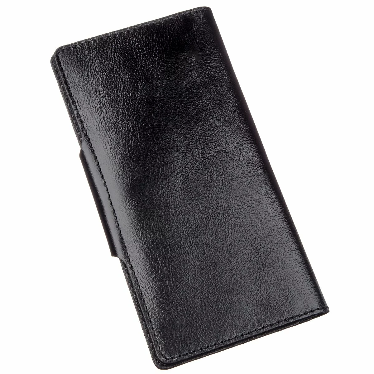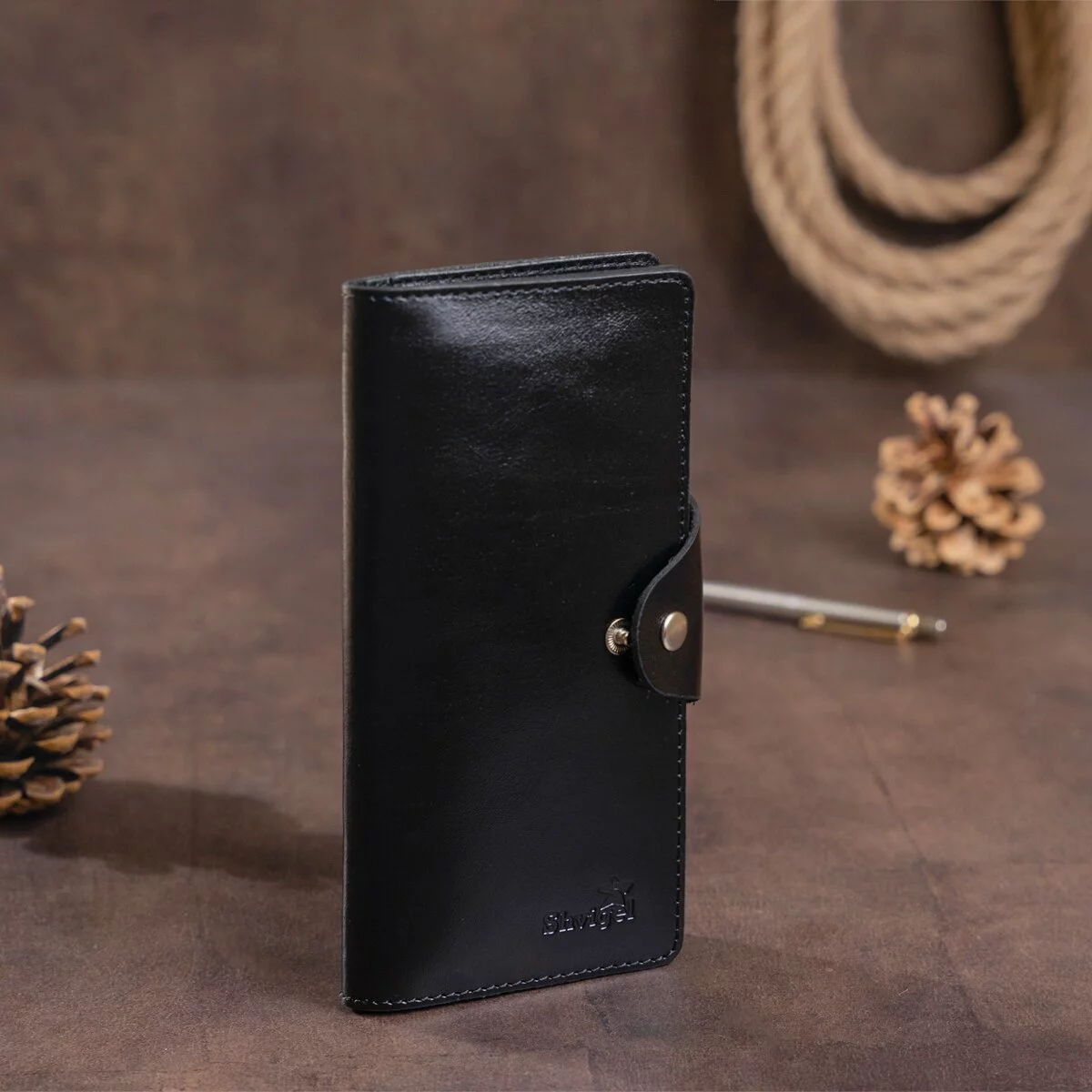 Качественный вертикальный бумажник из натуральной кожи алькор черного цвета. Отличительной особенностью такой кожи являются ее мелкие царапинки и блеск как в гладкой коже. Аксессуар очень красиво переливается на солнце. Просторные отделения для купюр и слоты для карточек будут держать ваши средства в порядке и в целостности. Аксессуар поместится в сумку или портфель. Украшена модель на лицевой стороне тисненым логотипом бренда. Закрывается изделие на одну их двух кнопок (ближнюю или дальнюю) в зависимости от его наполненности. Если вы находитесь в поиске подарка – советуем вам данную модель. Она доступна в разных цветах.