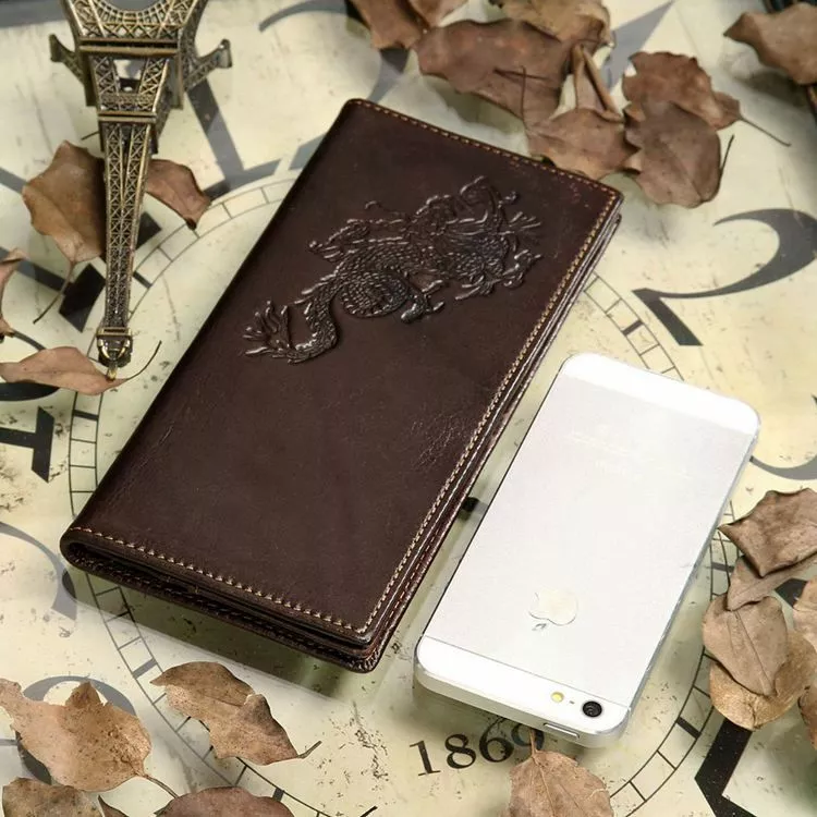Эксклюзивный мужской бумажник из натуральной кожи приятной на ощупь. Лицевая сторона изделия украшена тесненным декором с изображением «дракона». Аксессуар прошит прочной надежной нитью светло-коричневого цвета. Кошелек может стать великолепным подарком ко Дню Рождения или к Новому Году.