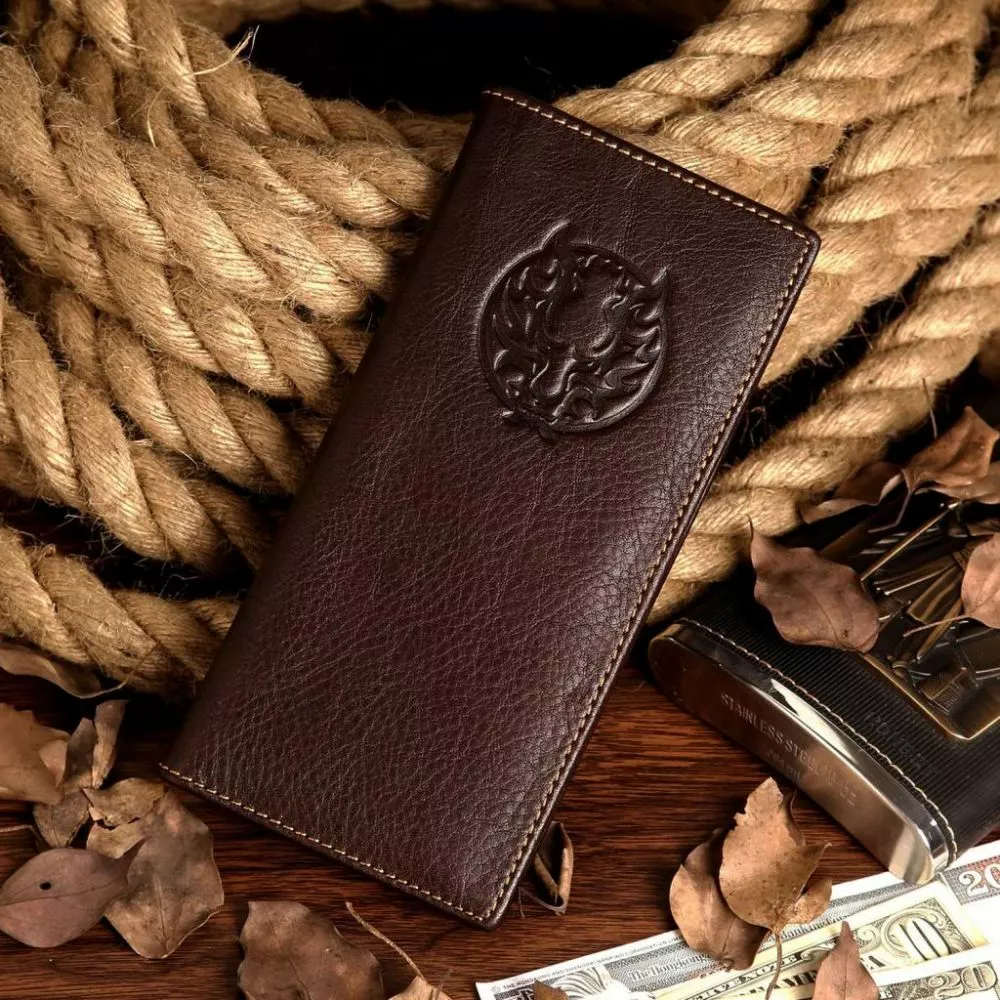Великолепный мужской бумажник из натуральной кожи. Лицевая сторона украшена тесненным декором в виде головы «тигра». Аксессуар прошит прочной нитью светло-коричневого цвета. Кошелек упакован в текстильный, пылезащитный мешочек белого цвета.
