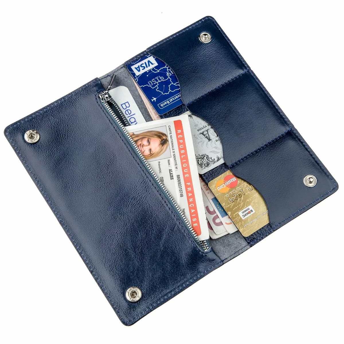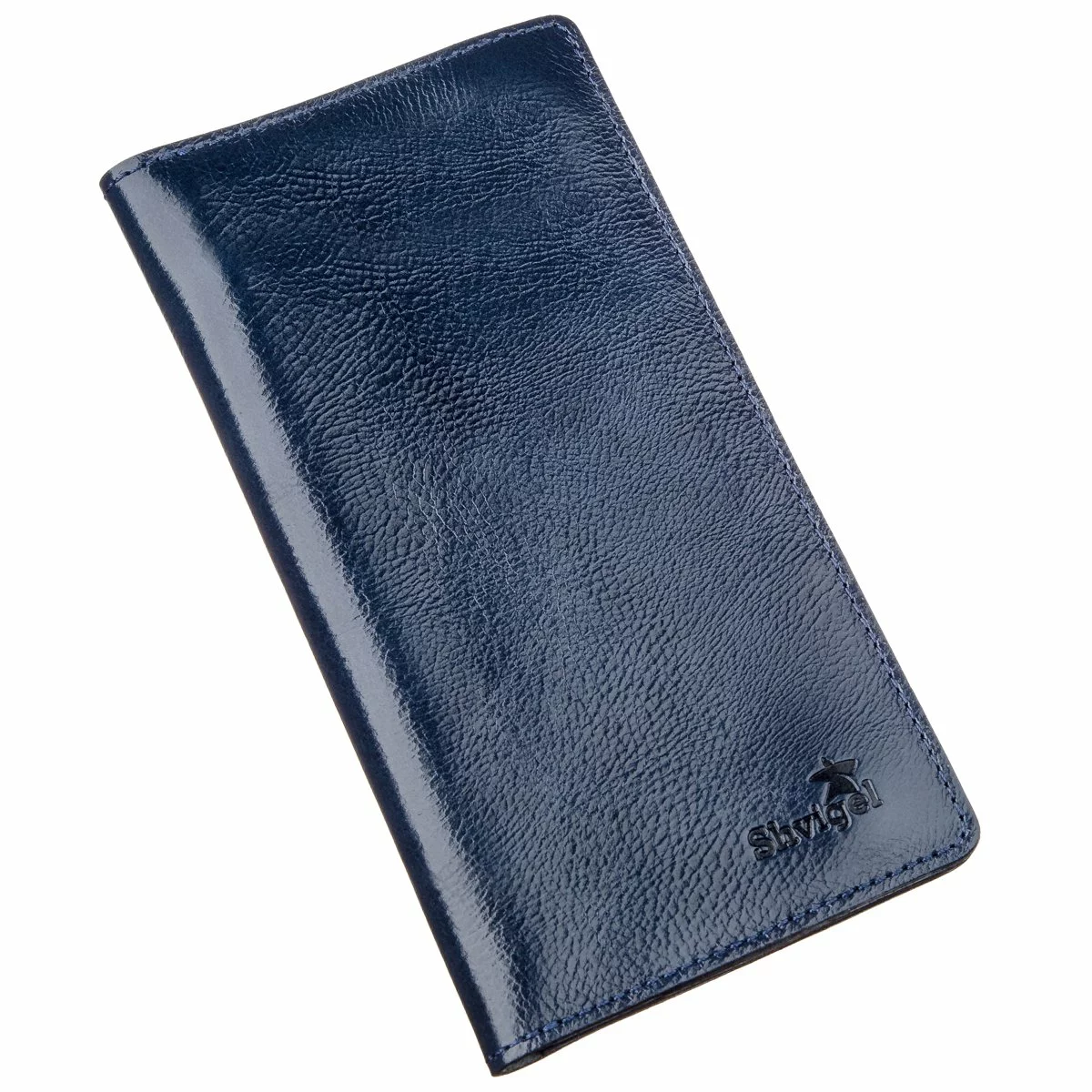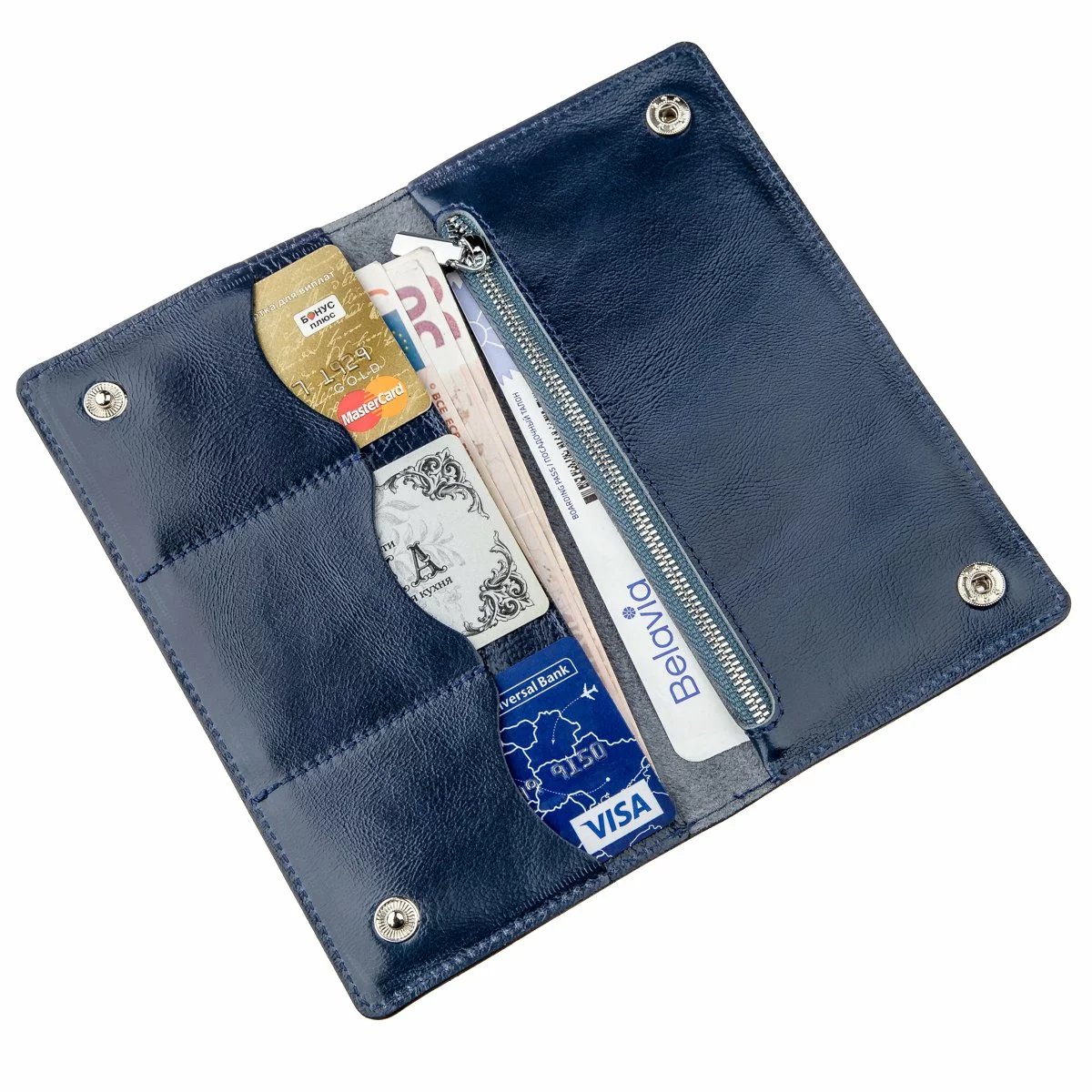 Солидный и мягкий кожаный бумажник стильного синего цвета.