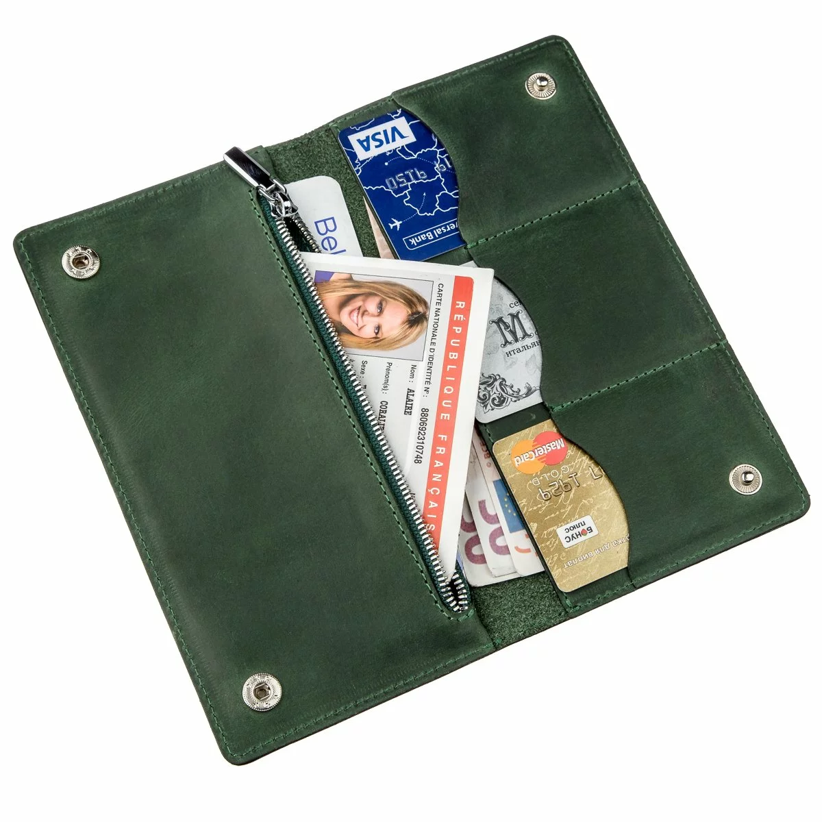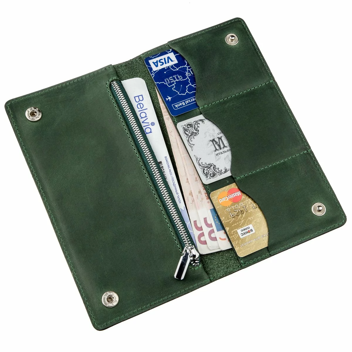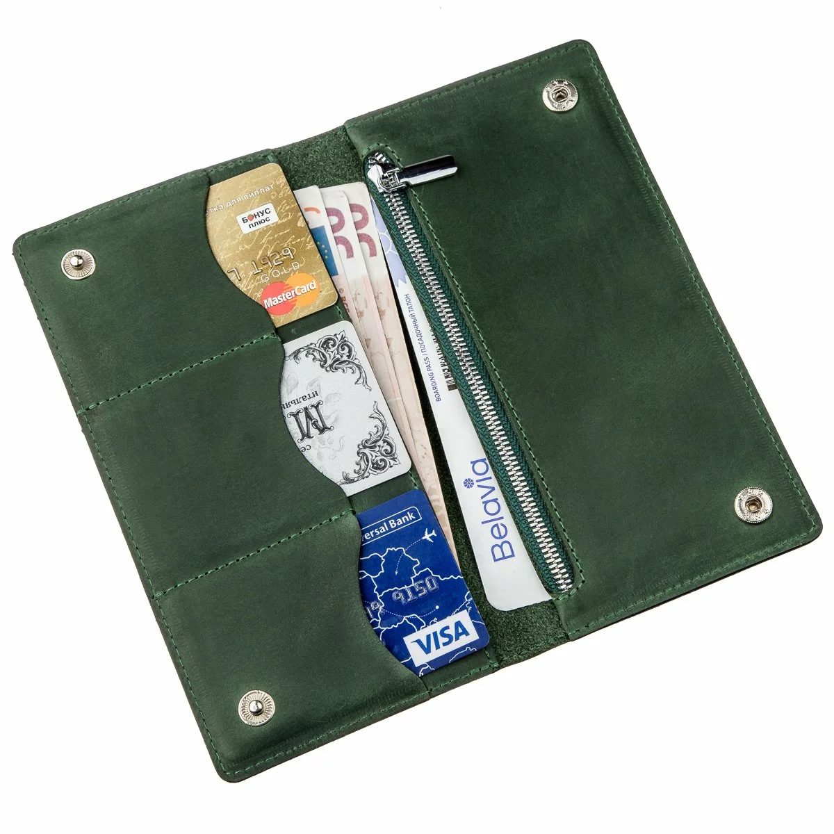 Изделие имеет отделения для купюр и слоты для карточек, а