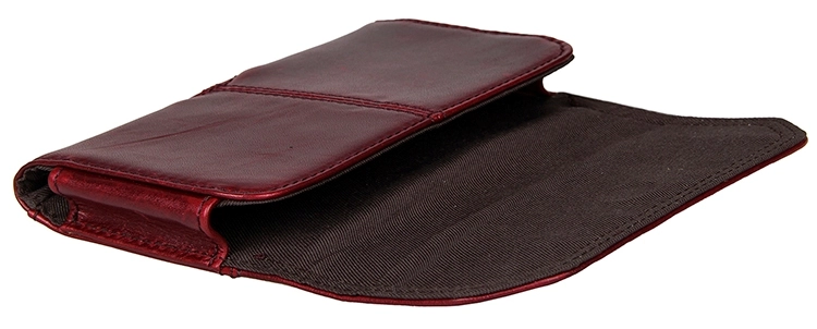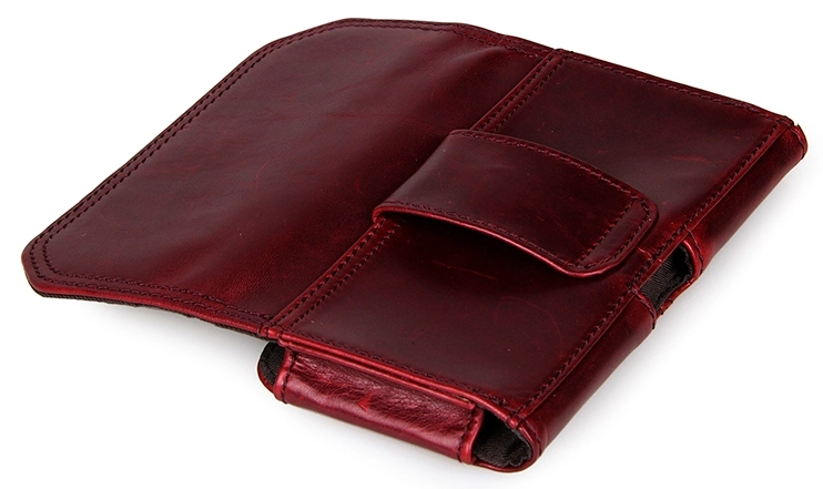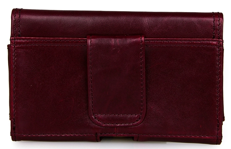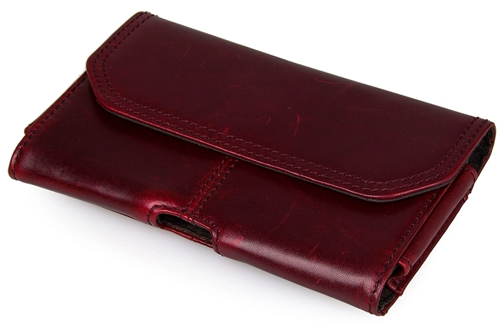 Удобный кожаный чехол для смартфона бордового цвета. Аксессуар аккуратно прошит сверхпрочной нитью. Изделие носится на пояс. Закрывается чехол с помощью скрытой магнитной кнопки. Внутри одно отделение. Аксессуар упакован в текстильный пылезащитный мешочек.