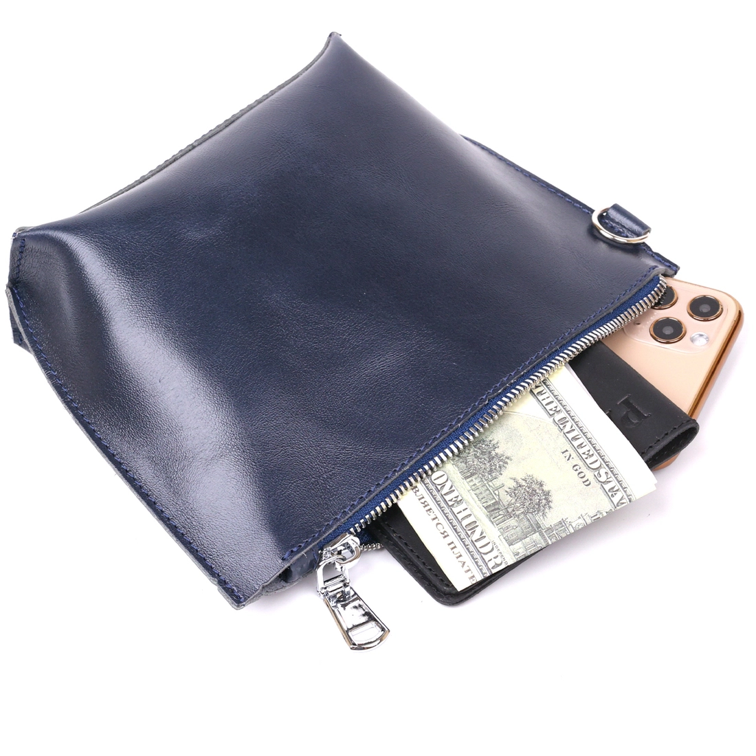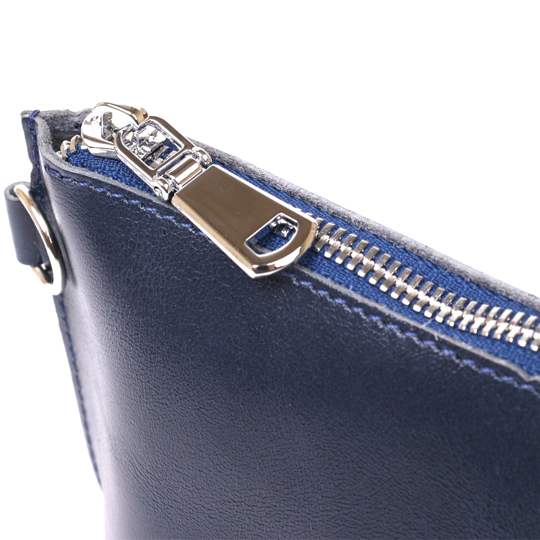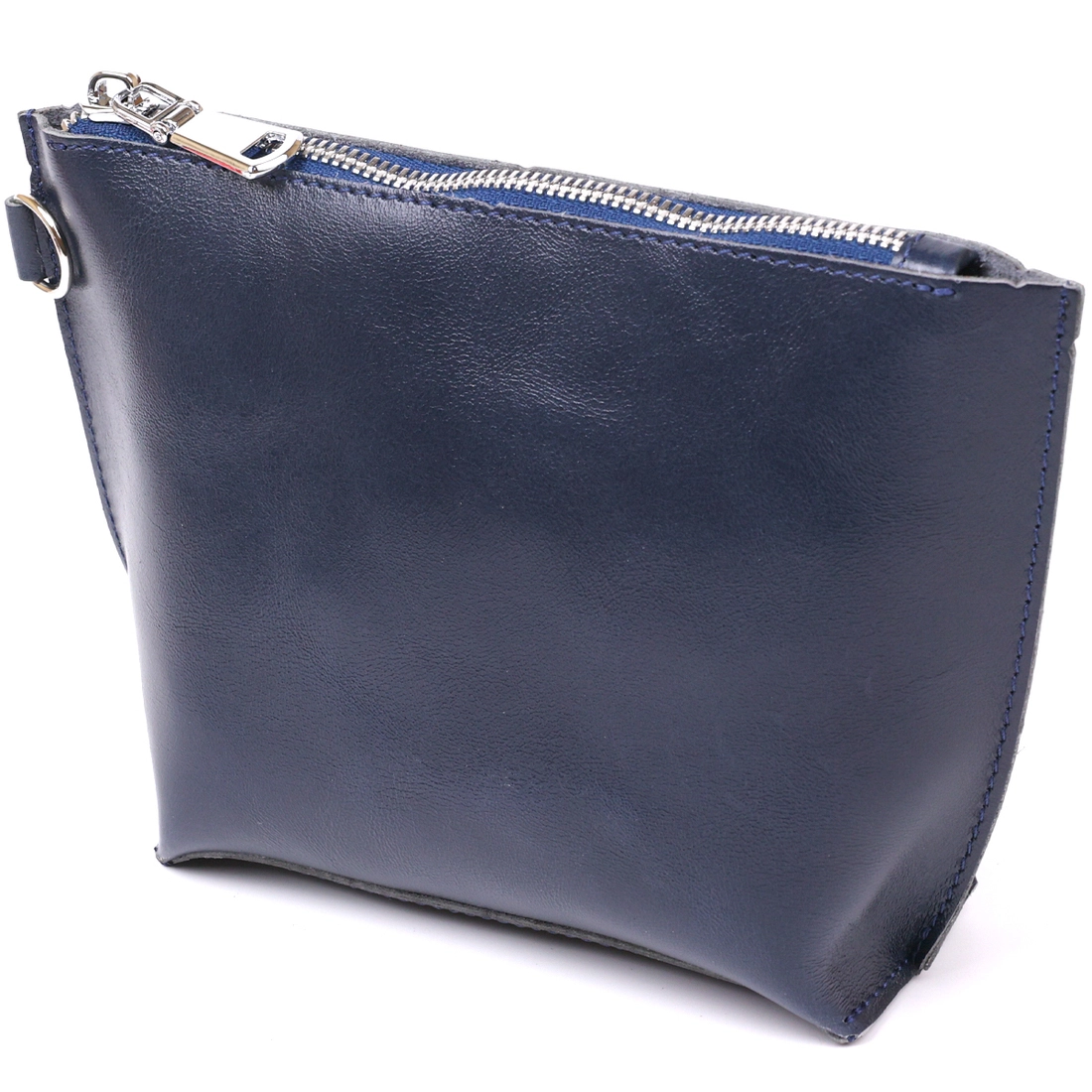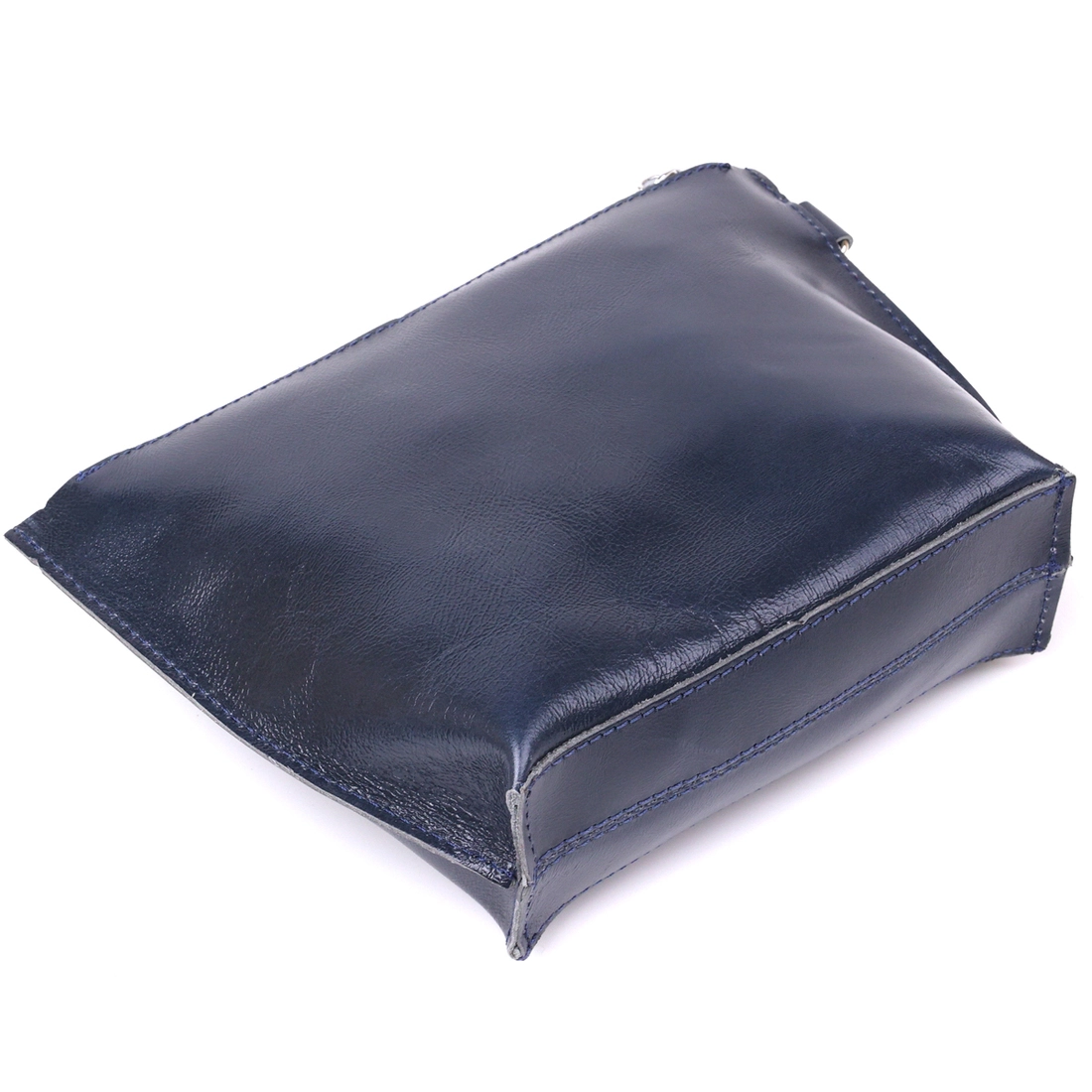 Добротная женская косметичка небольшого размера для мелких вещей от украинского производителя. Выполнена из натуральной высококлассной кожи повышенной прочности и стойкости к износу. Цвет изделия – темно-синий с легким отливом, фактура – гладкая и приятная на ощупь. Закрывается аксессуар на молнию серебренного цвета.