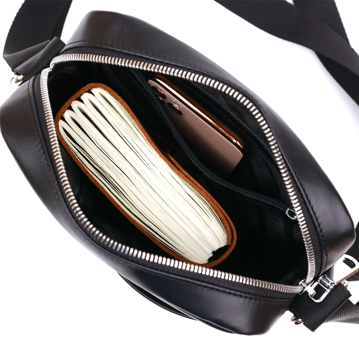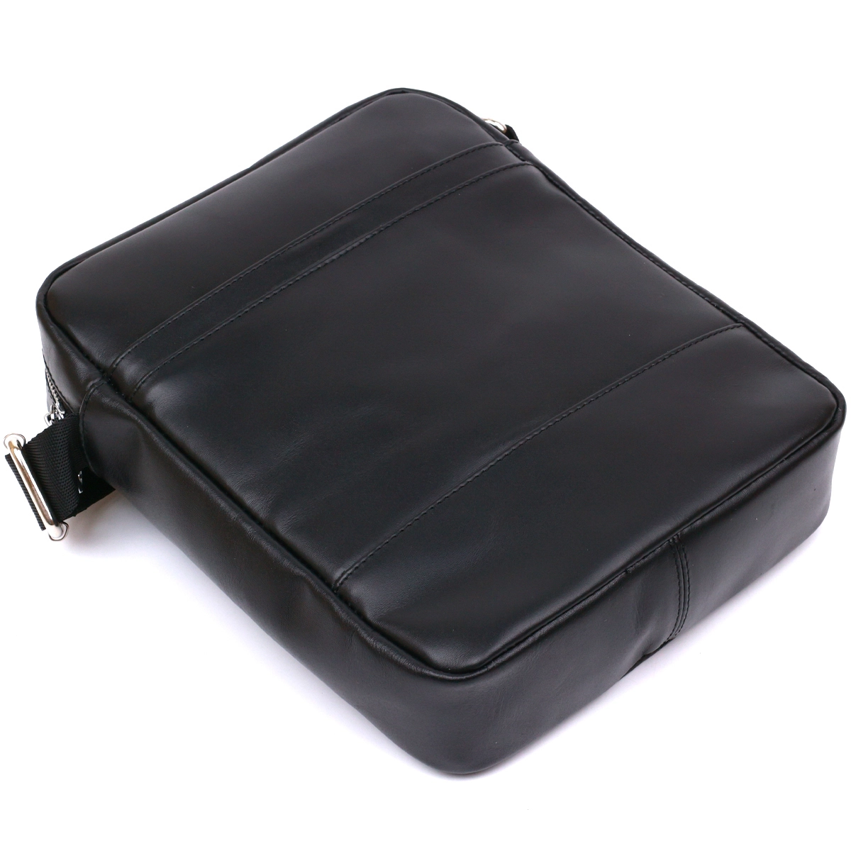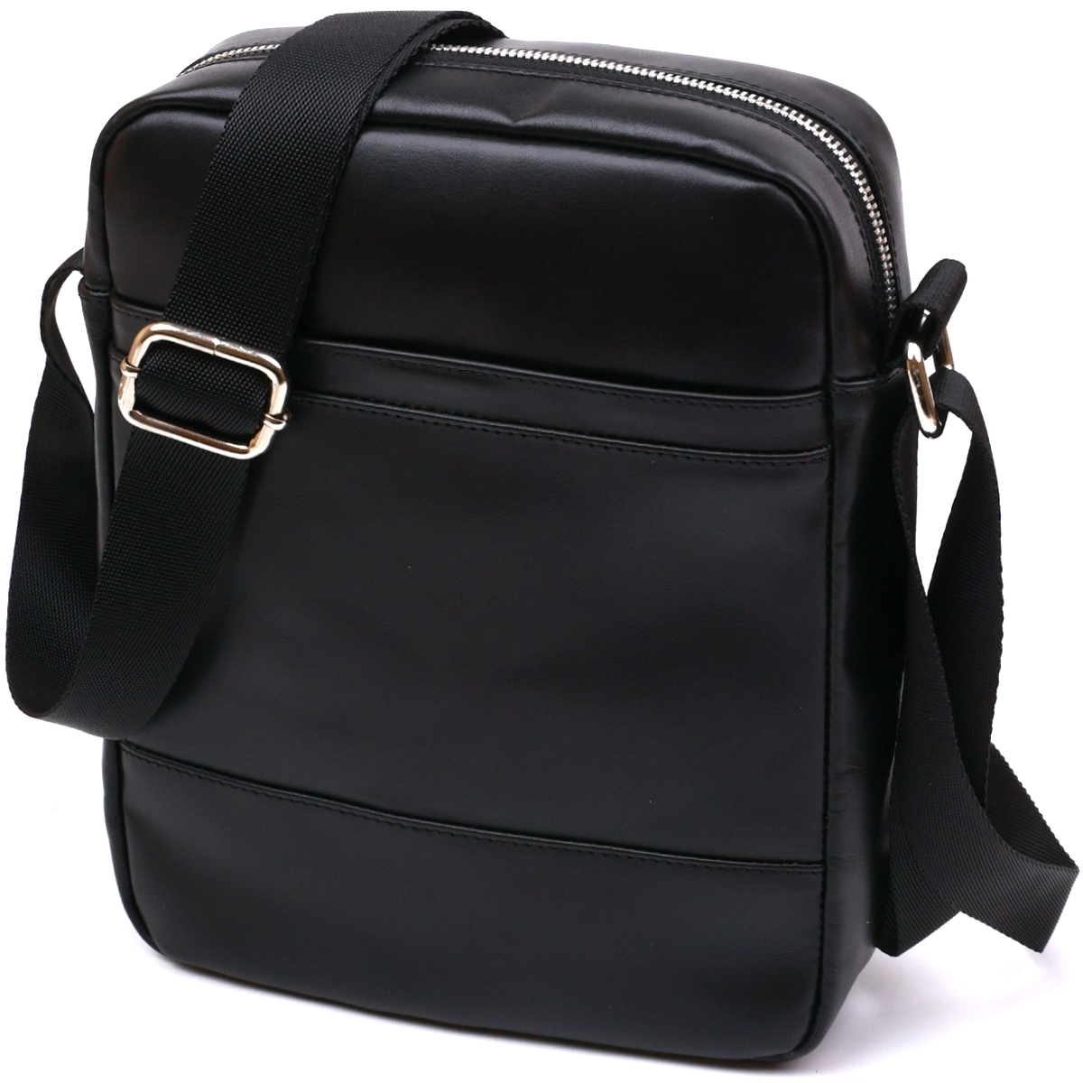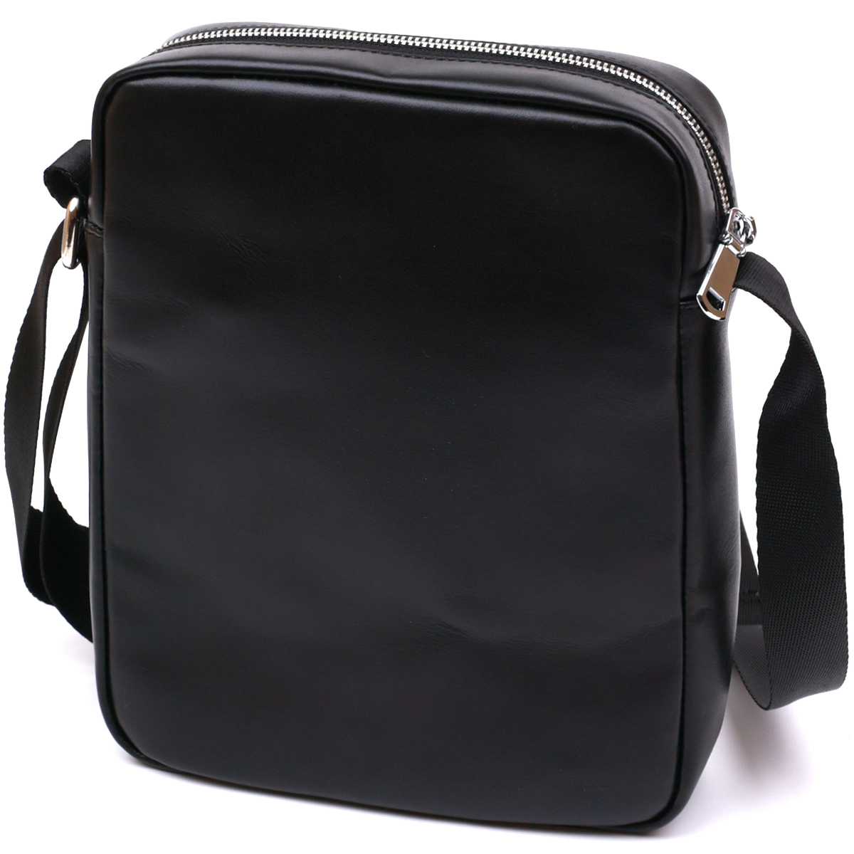 Отменная мужская сумка через плечо в стильном современном дизайне. Материал изготовления натуральная высокопрочная кожа, качество которой видно невооруженным глазом. Внутреннее наполнение представлено в виде основного отделения на молнии и двух карманов. Ремень выполнен из текстиля и регулируется по длине. Цвет данной модели –универсальный черный, фактура – гладкая.