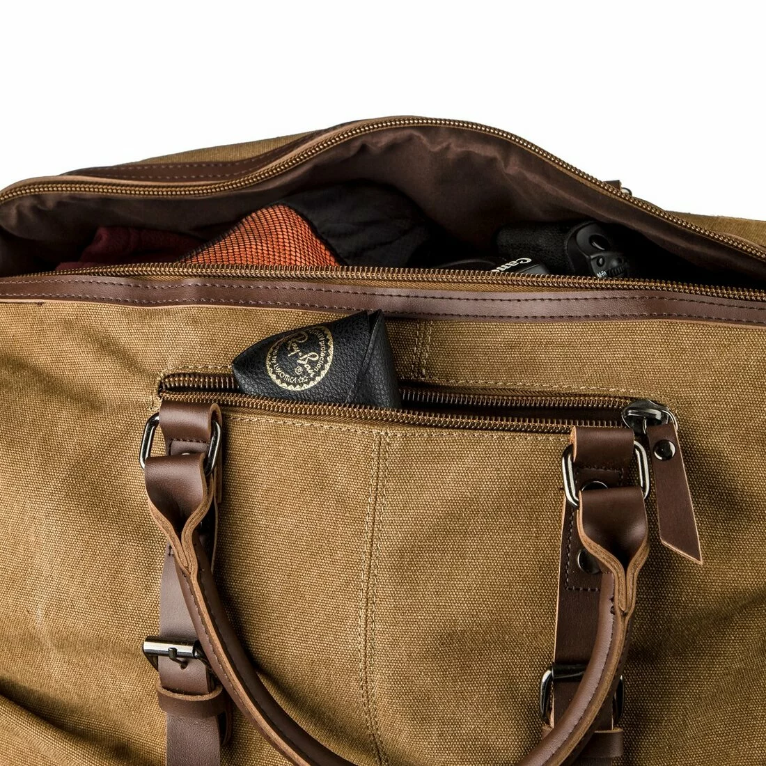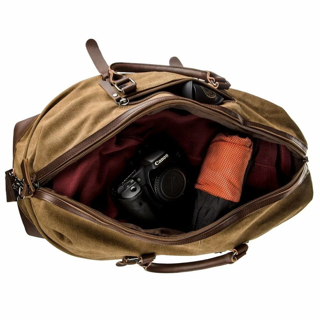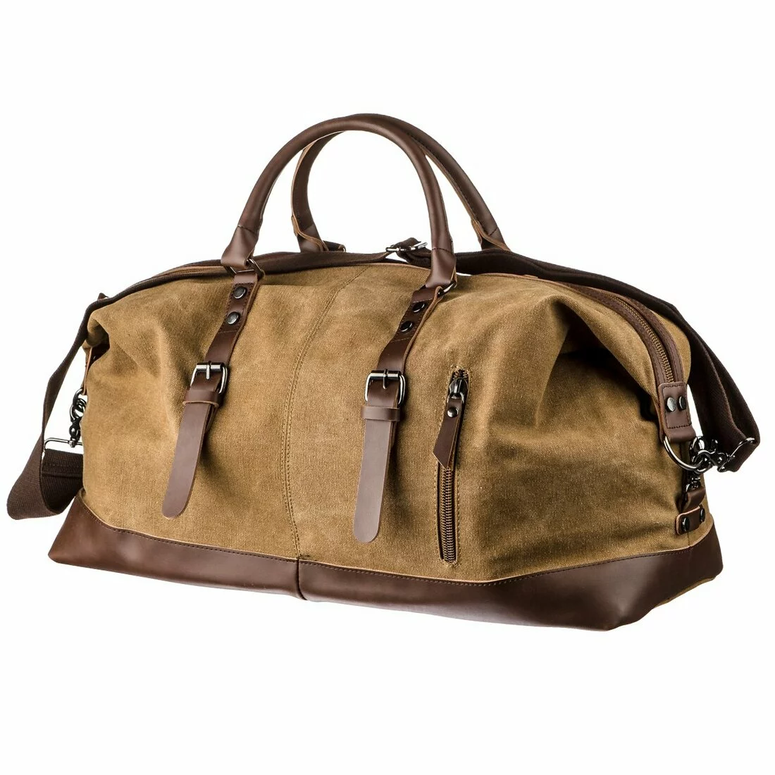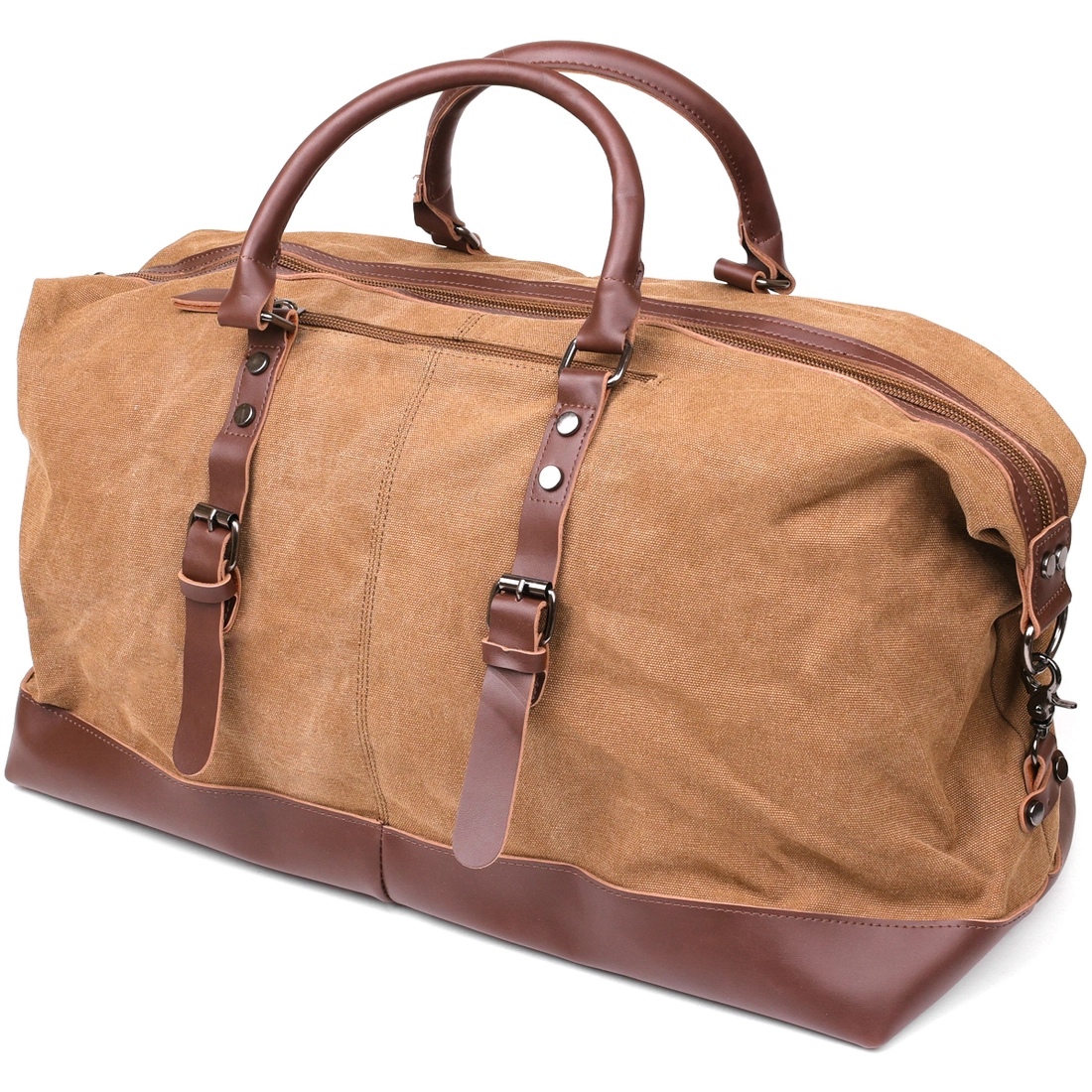 Вместительная походная сумка песочного цвета из прочного текстиля.