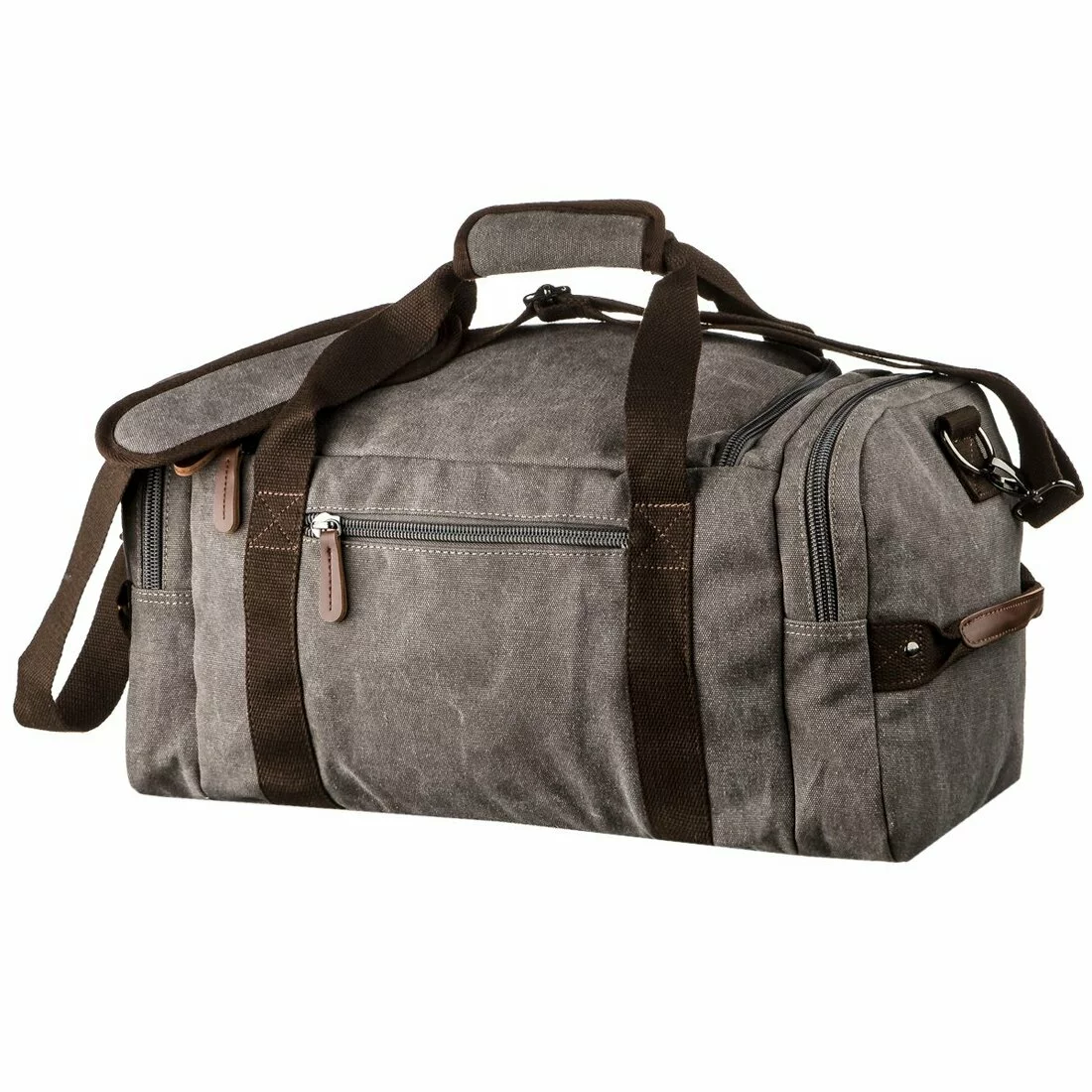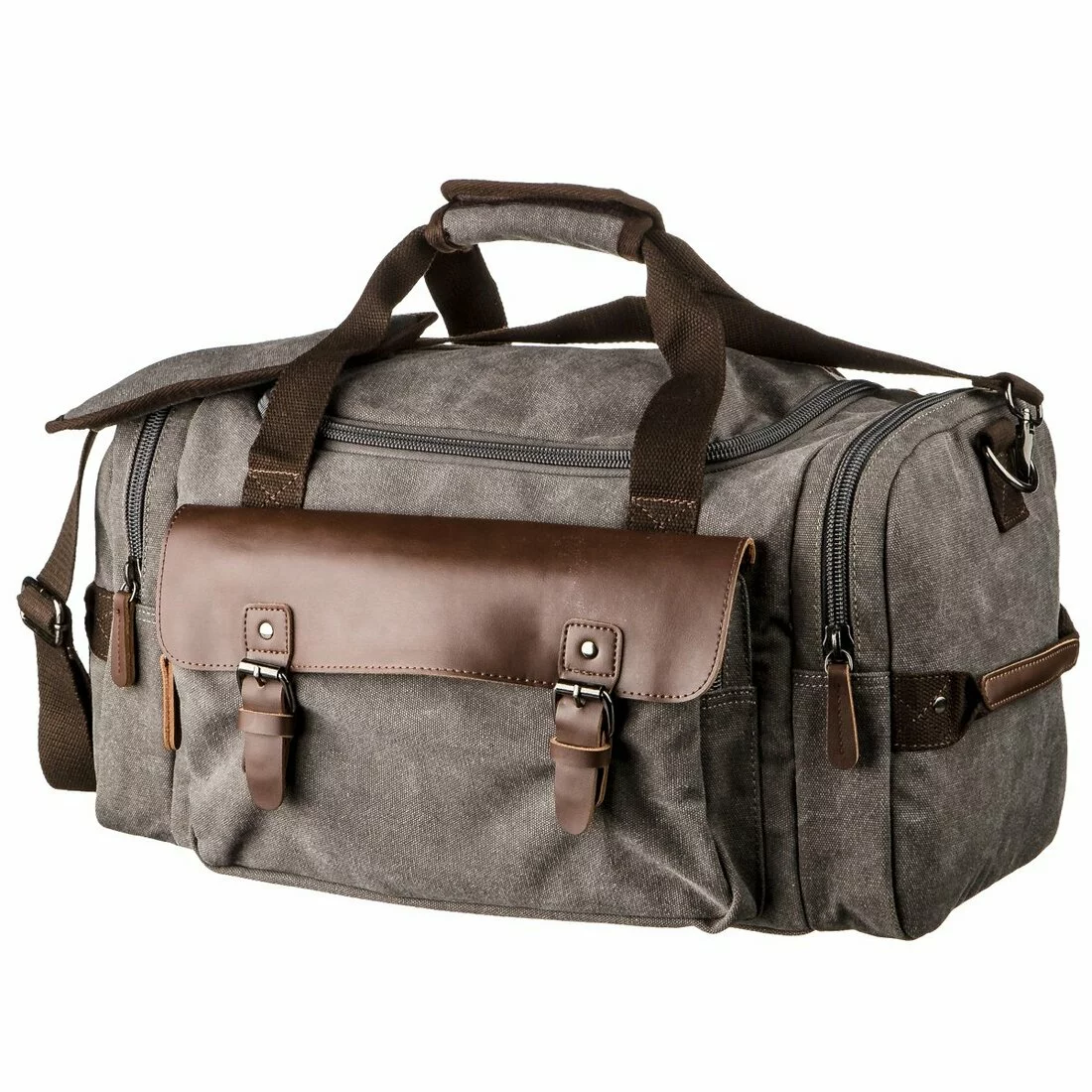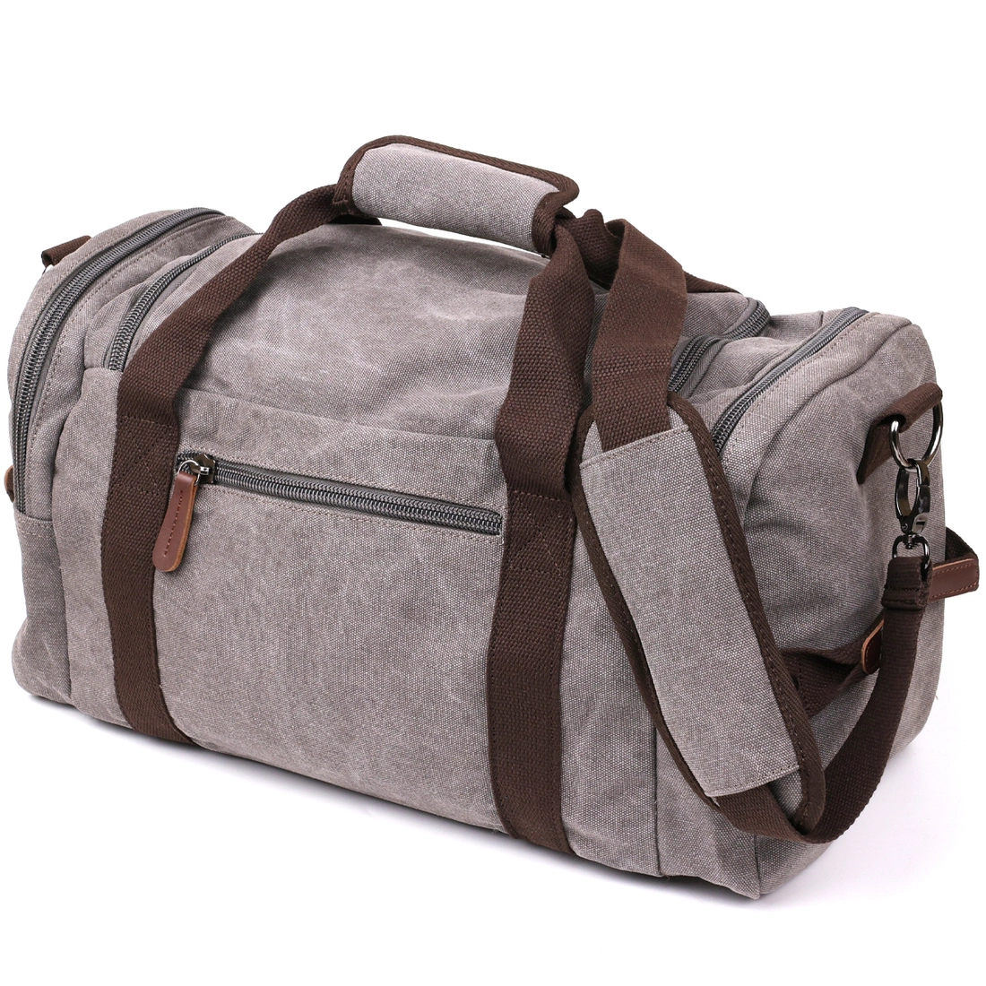 Прямоугольная текстильная дорожная сумка. Модель имеет 2 кармана по
