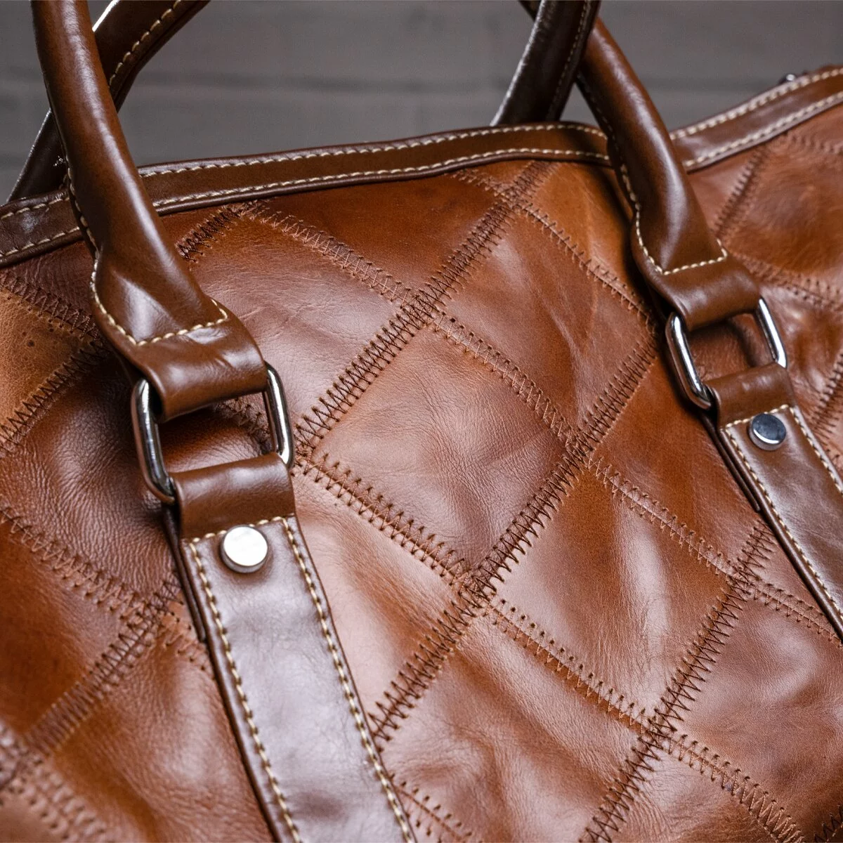 зал. На лицевой стороне сумка прошита строчкой коричневой нитью.