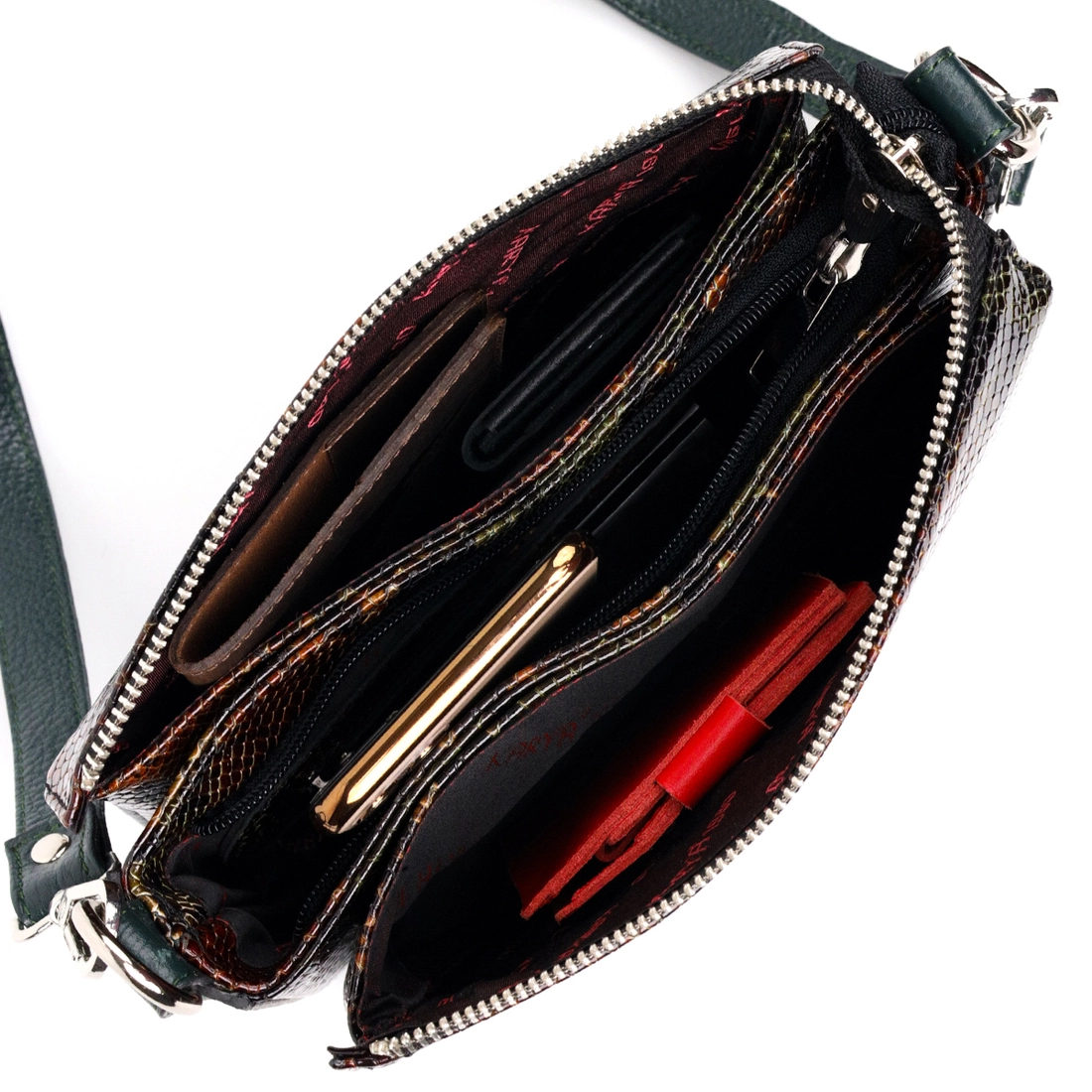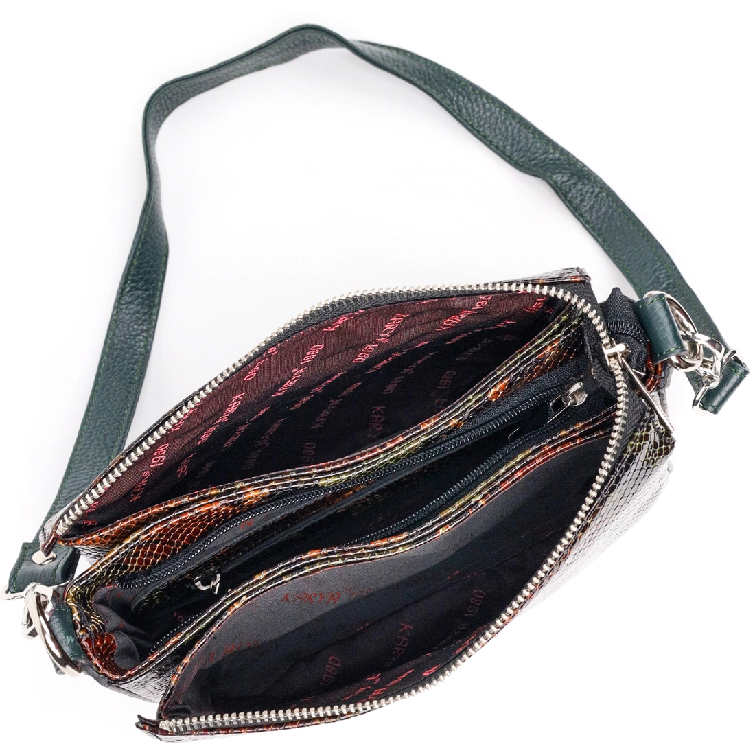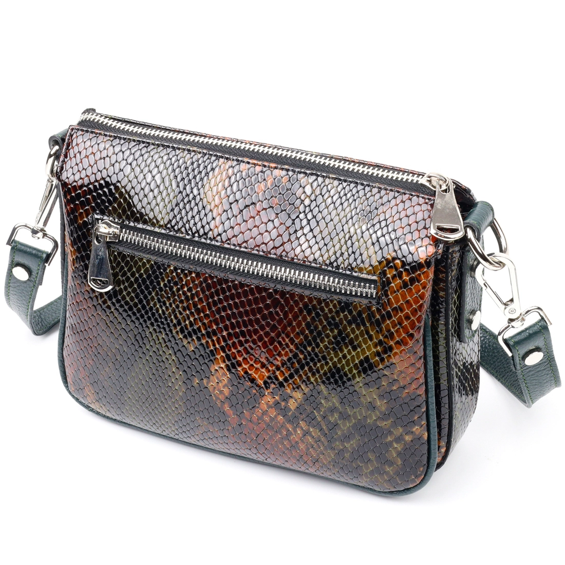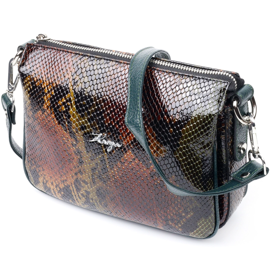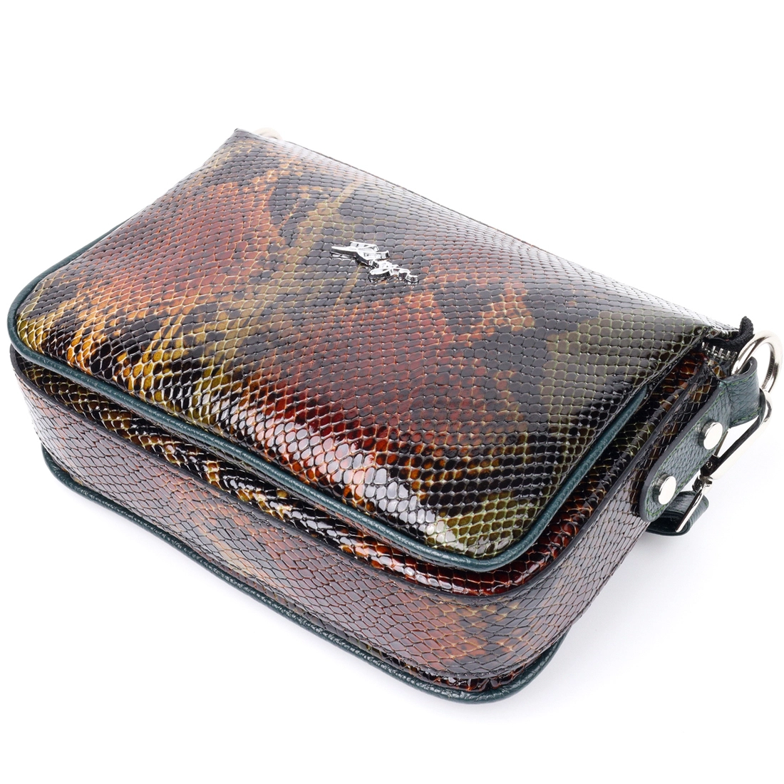 Женская лакированная сумка небольшого размера из натуральной кожи, с тиснением под змею, в необычном зелено-коричневом цвете. Фурнитура серебряного цвета. Сумку удобно носить в руке, на плече или через плечо. Сумка упакована в фирменный текстильный чехол Karya. Сумка из натуральной кожи всегда будет отличным подарком любой женщине.