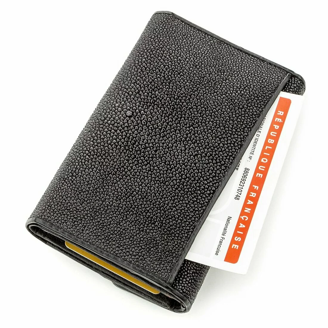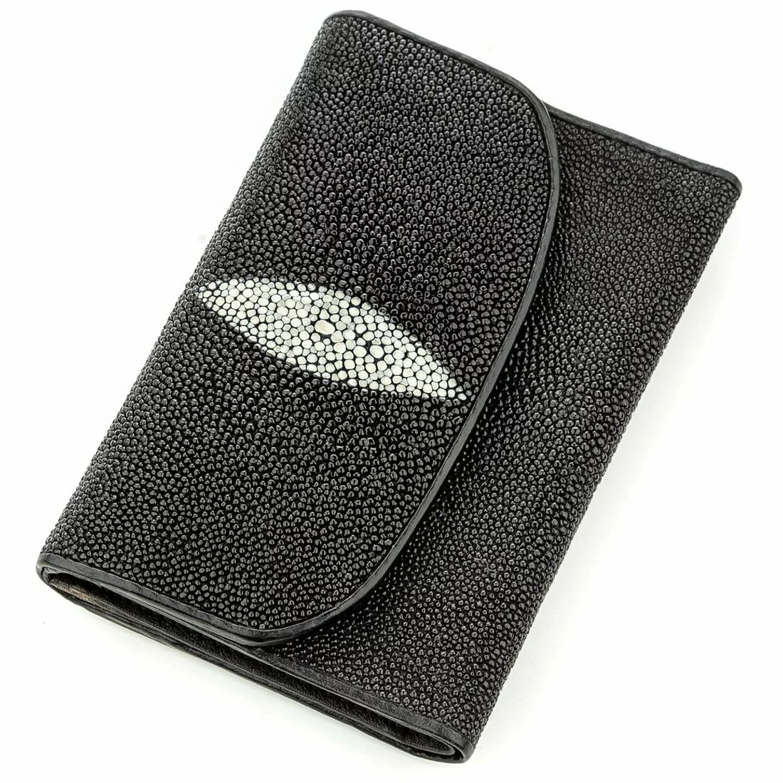 Кошелек выполнен из натуральной кожи морского ската. Аксессуар имеет классический и оригинальный дизайн, выполнен в классическом стиле. Изделия из кожи морского ската обладают необычайной красотой и высокой износостойкостью к разного типа сколам, порезам, царапинам и даже огню. На внешней стороне изделия рисунок в виде глазка из крупных белых бусинок. Кошелек отлично подойдет как для вечернего образа, так и на каждый день. В него просто невозможно не влюбиться. Модель закрывается на клапан с магнитной кнопкой. Прекрасный подарок как для себя так и для близкого человека.