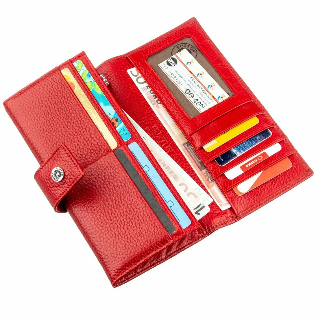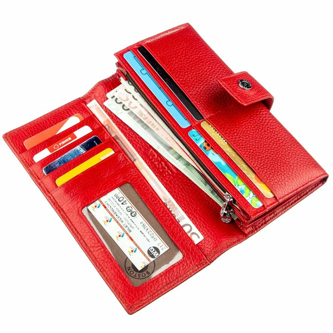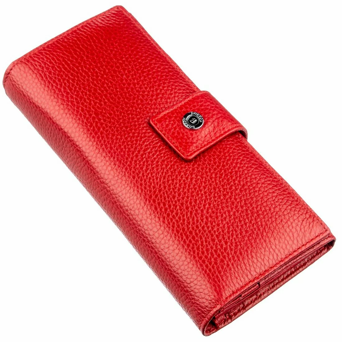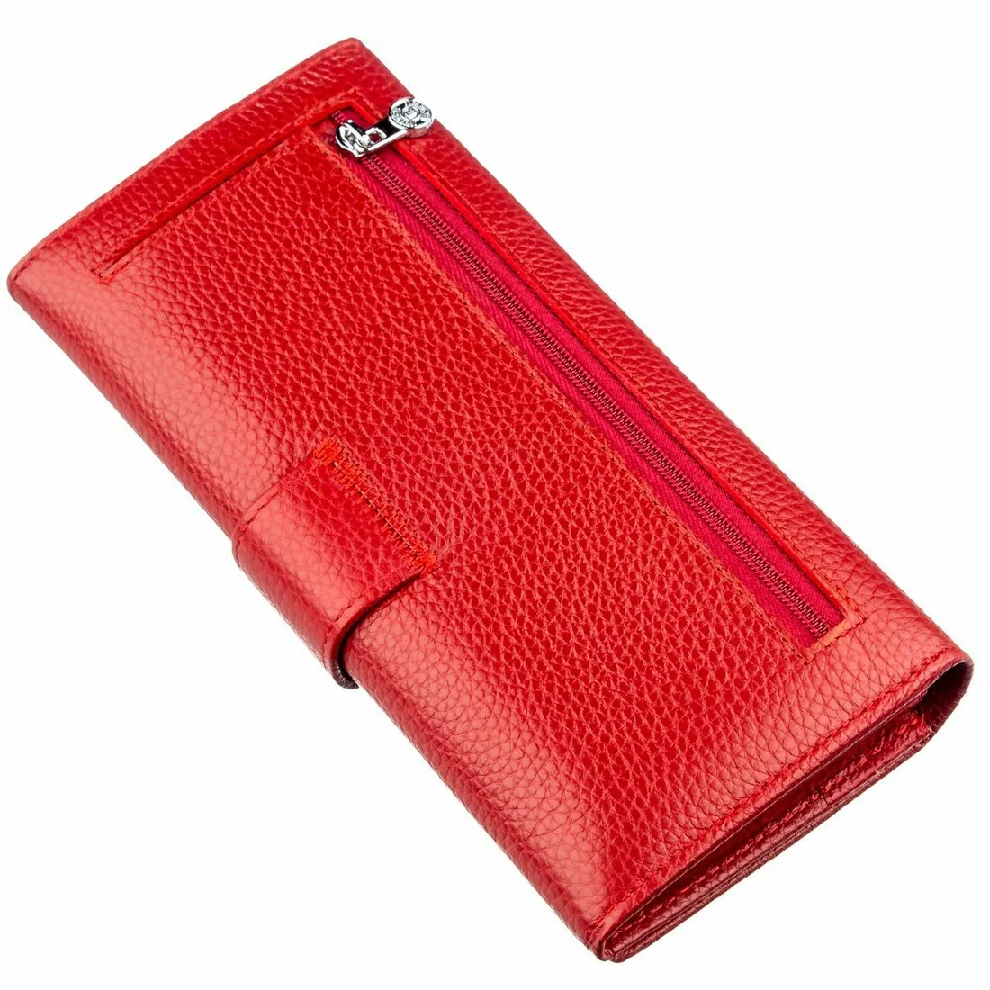 Изысканный женский кошелек из натуральной кожи красивого красного цвета. Кожа, которая использована для изготовления этого кошелька, имеет зернистую матовую фактуру. Она мягкая и приятная на ощупь, имеет превосходные эксплуатационные характеристики, и прослужит Вам долгое время. Владелицу данного аксессуара порадует его вместительность и практичность, так как в нем есть большое количество различных отделений, в том числе и на молнии, что предотвращает непредвиденное выпадение мелочей. Также в кошельке предусмотрено четырнадцать карманов для визиток, карт и кредиток. Сделайте себе или другому близкому человеку такой подарок и он останется очень довольным. Упаковано данное изделие в плотную картонную коробку.