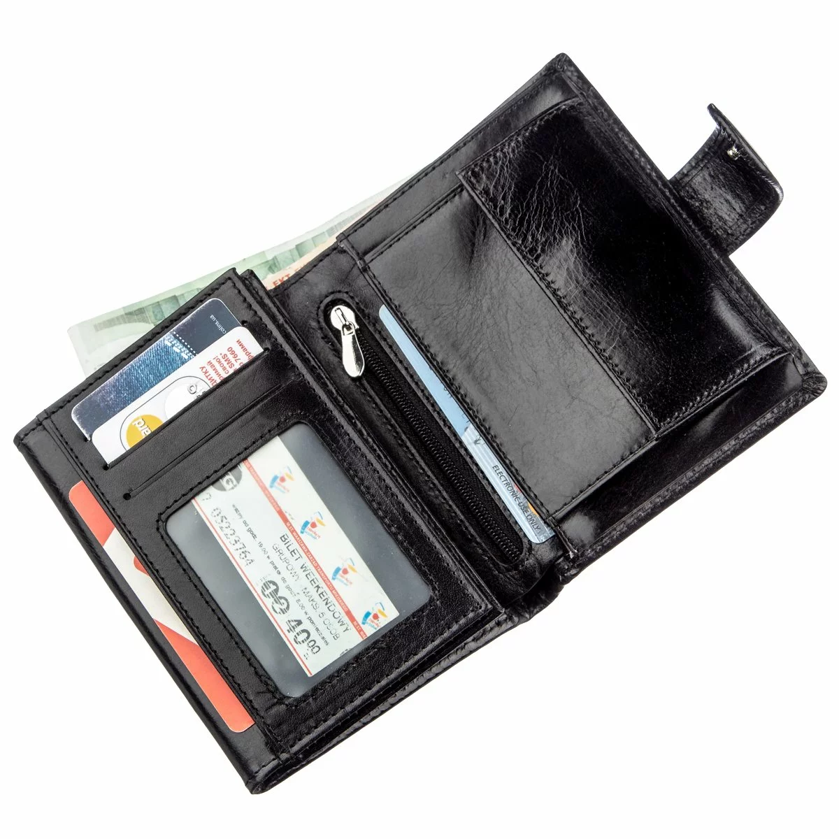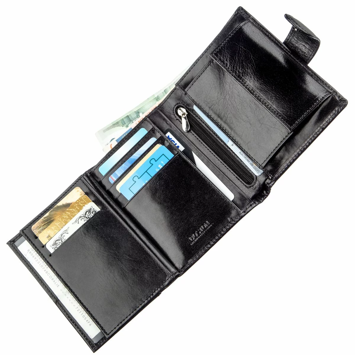 Классический мужской кошелек из натуральной кожи черного цвета. Имеет все необходимые отделения и карманы для делового человека. Главной особенностью кошелька является его особая практичность и удобность в использовании, он прекрасно ложиться как в сумку или борсетку, так и в карман, не причиняя абсолютно никакого дискомфорта. Выполнен в сдержанном стиле для серьезных мужчин любого возраста. Отличается высоким качеством кожи, которая обязательно порадует Вас своей долговечностью. Купив данный аксессуар для себя или на подарок, Вы гарантировано останетесь очень довольны. Кошелек продается в твердой картонной фирменной коробке.