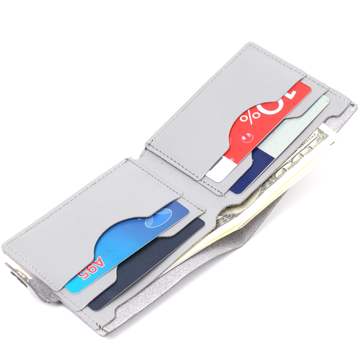 Классическое портмоне в современном дизайне и трендовом сером цвете. Выполнено изделие из натуральной кожи высокого качества и отличной устойчивости к износу. Портмоне имеет вместительное отделение для купюр, слоты для пластиковых карточек. Закрывается аксессуар на кнопку. Если вы подыскиваете подарок для близкого человека, то данная модель отлично для этого подойдет.