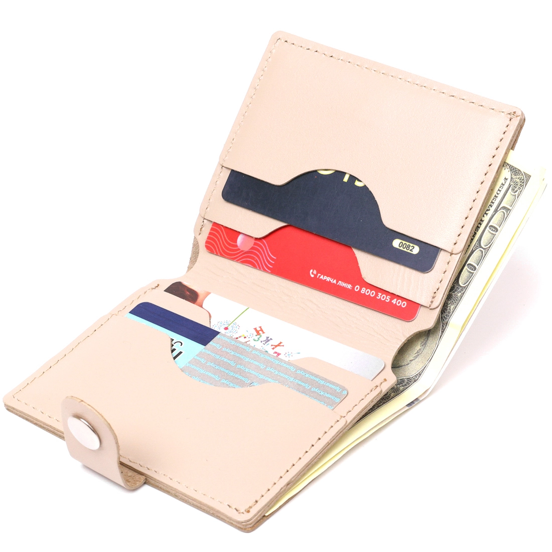 Отличное портмоне в лаконичном дизайне от украинского производителя. Материал – натуральная кожа с улучшенными показателями прочности и износостойкости. Внутри есть вместительно отделение для купюр, слоты для пластиковых карточек и небольшая монетница на кнопке. Закрывается данная модель на хлястик с кнопкой.