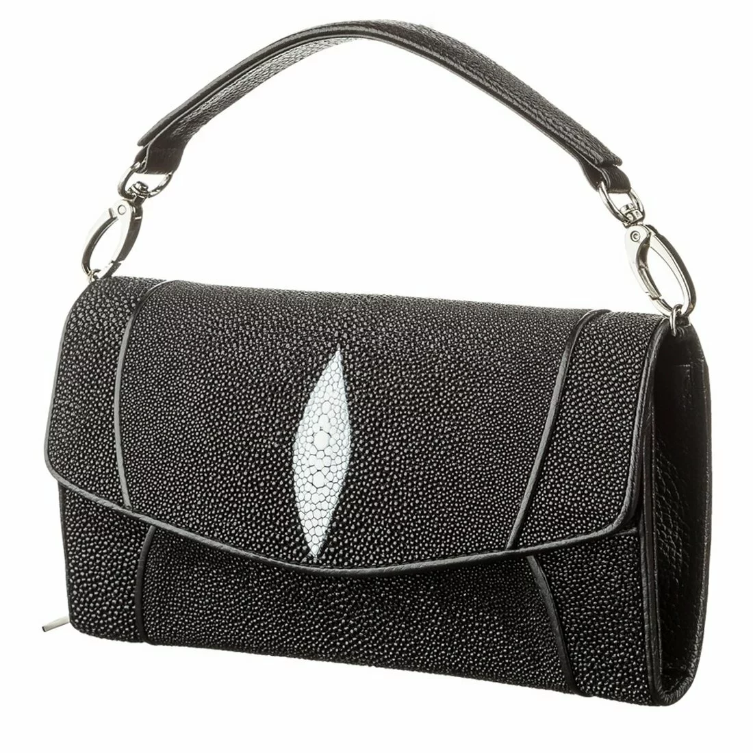 Роскошный женский клатч в классическом стиле из натуральной кожи морского ската. Издавна аксессуары из ската являются элементом роскоши и богатства их владельца. Клатч будет идеальным дополнением как вечернего, так и каждодневного образа. Модель имеет удобную ручку и прекрасно сидит в руке. Изюминкой аксессуара есть рисунок в виде глазка из крупных бусин белого цвета. Модель имеет высокую износостойкость, и долгое время остается в идеальном состоянии. Идеальный подарок для любой женщины.