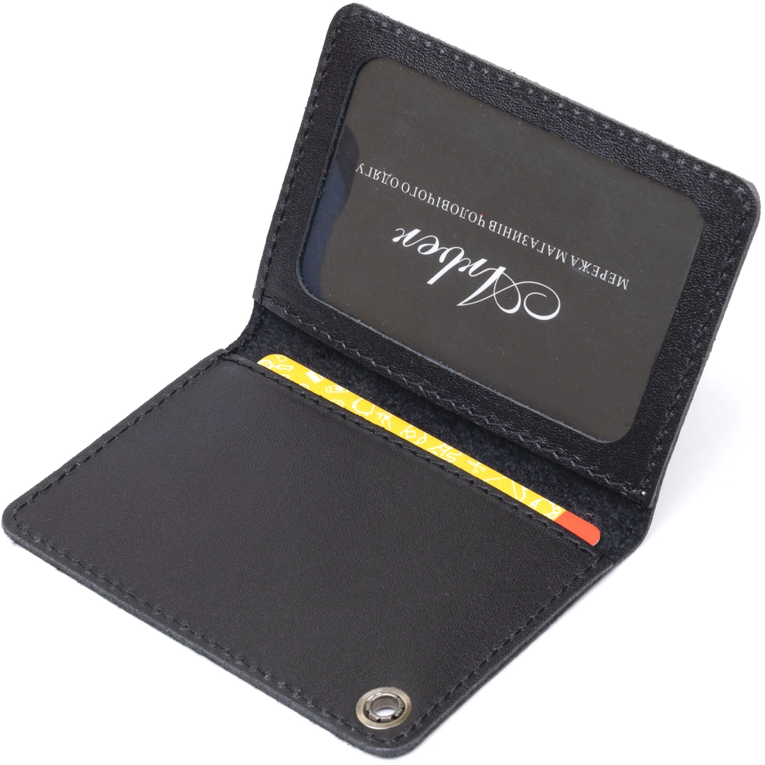 Закрывается в виде книжки. Небольшое прозрачное окошко и надпись