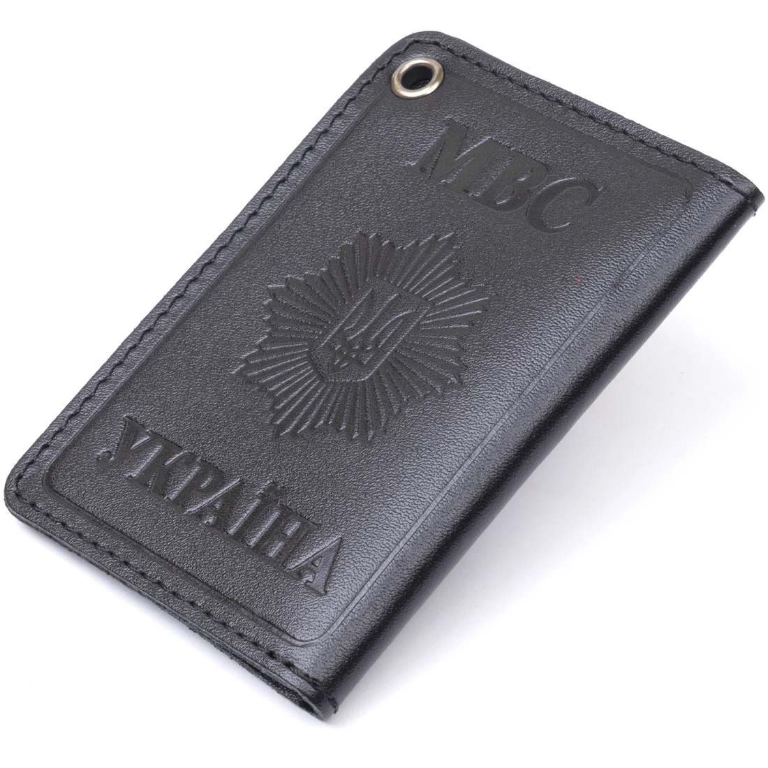 тризубец на звезде и надпись «МВС Україна». Сверху люверс, с