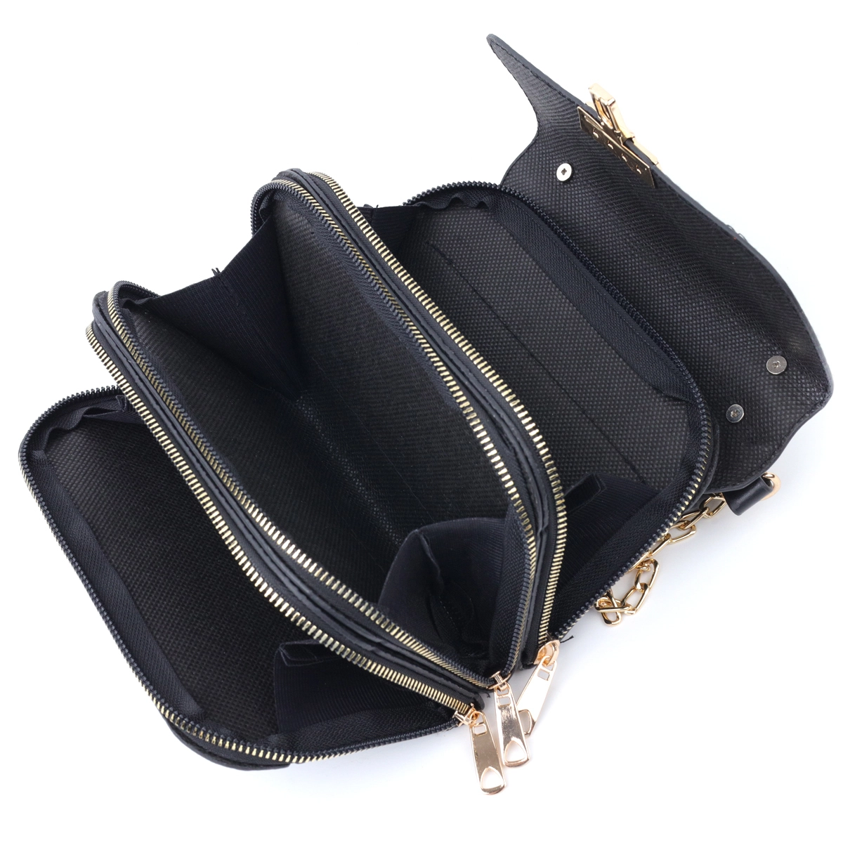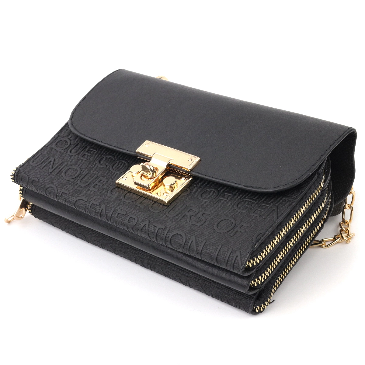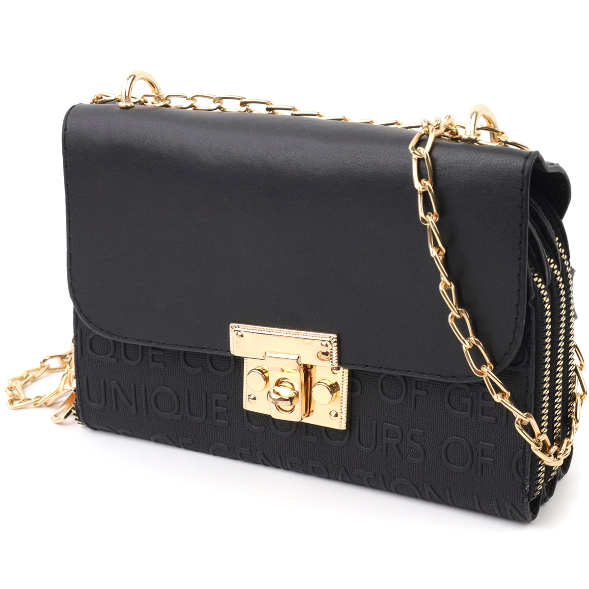 Красивая миниатюрная сумка черного цвета, из качественной эко-кожи с буквенным тиснением. Сумка имеет стильный дизайн, красивую механическую защелку золотистого цвета, регулируемый наплечный ремень из металлической цепочки и вставки с эко-кожи. Модель долгое время остается в идеальном состоянии, такую сумку приятно носить. Может быть отличным вариантом для подарка стильной женщине.