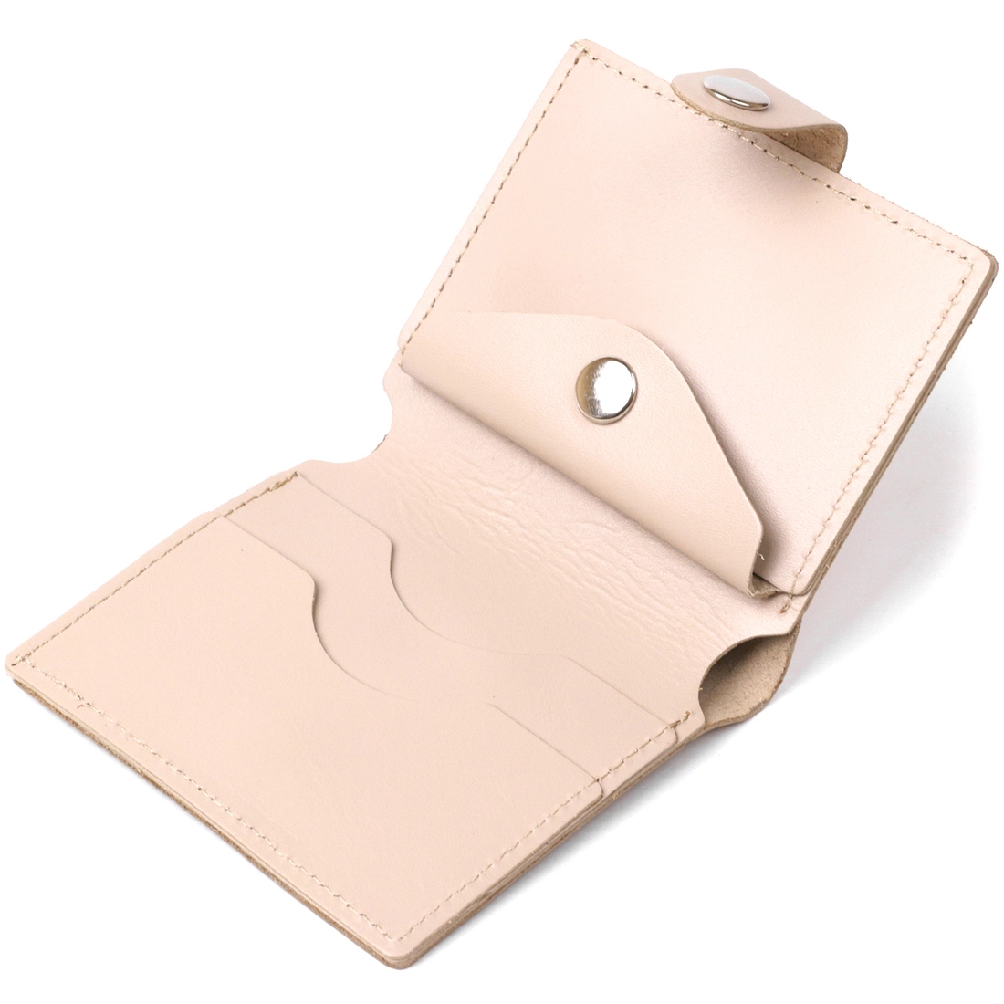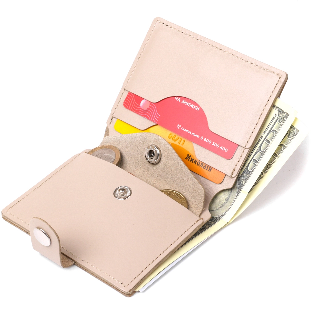Превосходное портмоне высокого качества от украинского производителя. Имеет красивый бежевый цвет и гладкую приятную на ощупь фактуру. Материал изготовления – натуральная кожа с отменными эксплуатационными характеристиками. Внутри присутствует основное отделение на всю длину, кармашки для пластиковых карточек и небольшая монетница на кнопке.