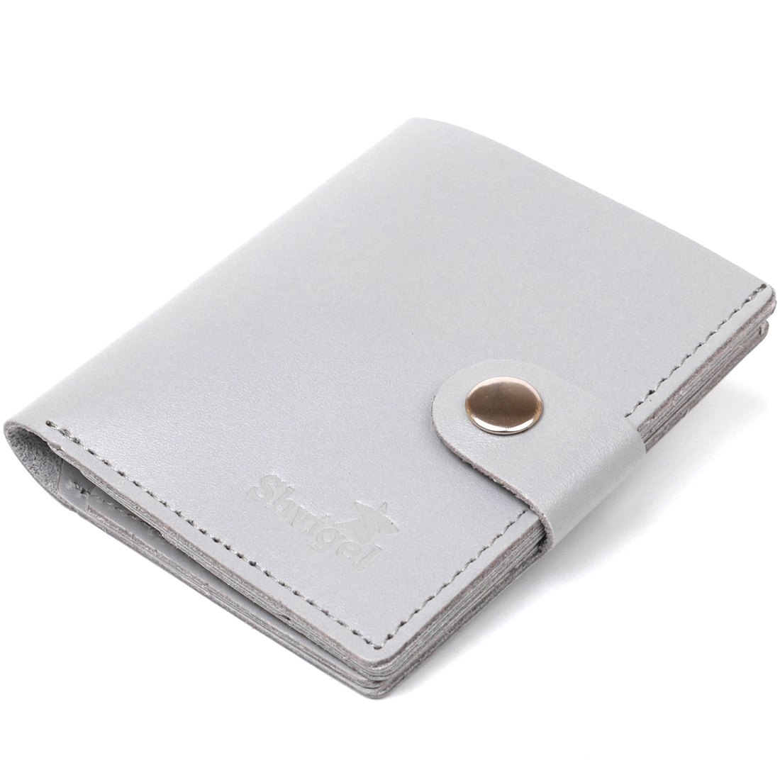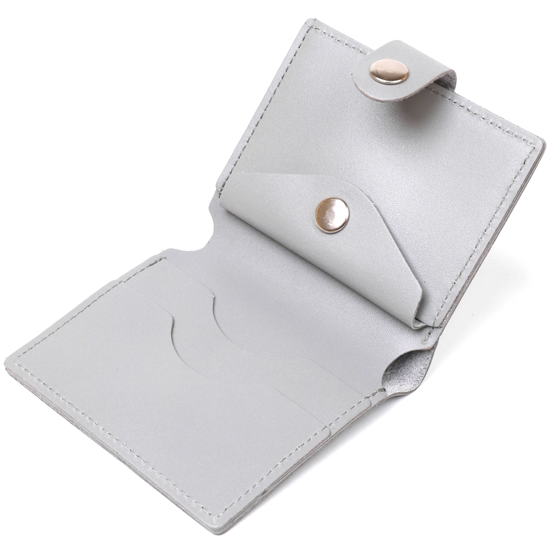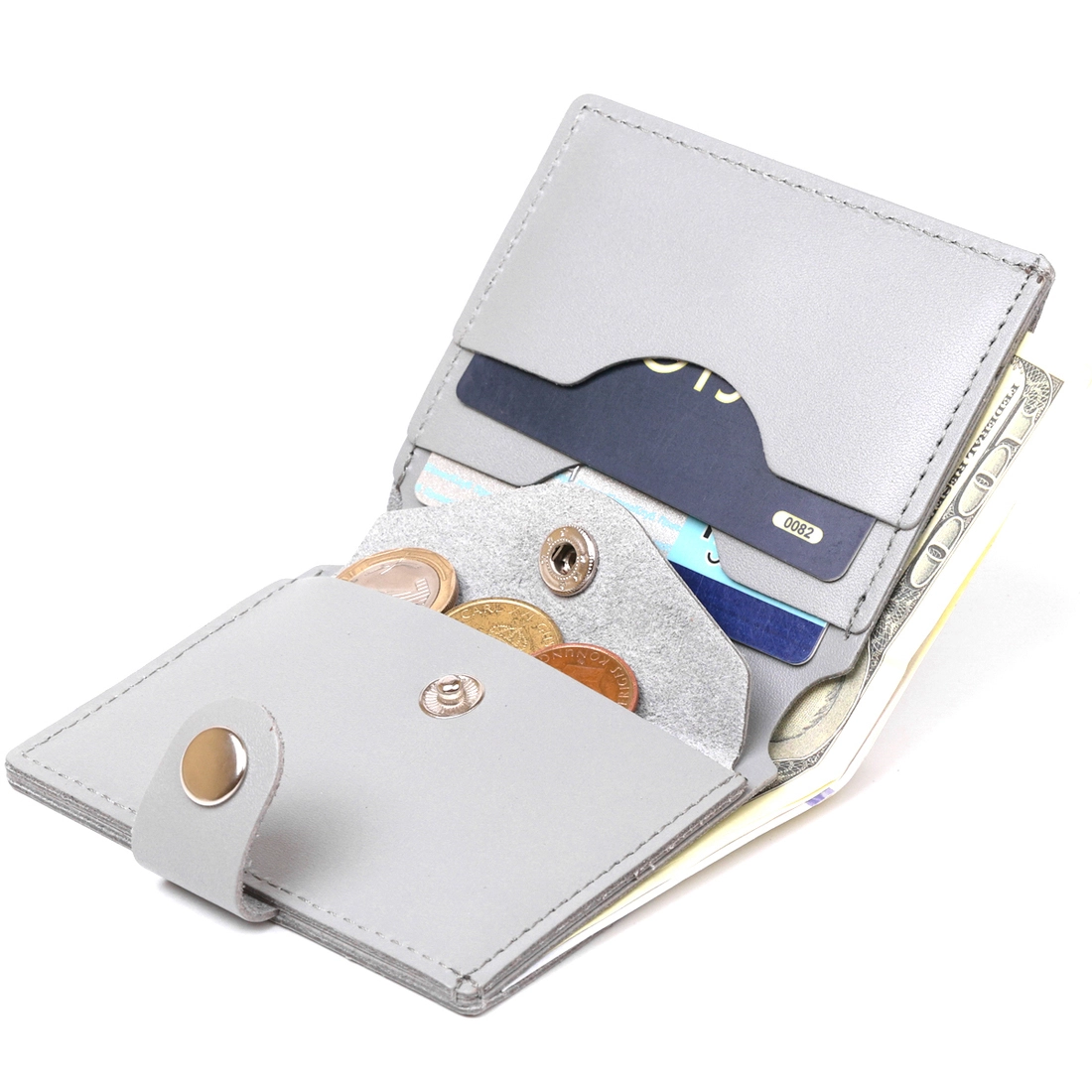 Добротное портмоне компактного размера в модном и современном сером цвете для тех, кому надоели темные и безликие вещи. Данная модель имеет простой сдержанный дизайн. Материал – натуральная кожа с отличными показателями прочности. Внутри есть вместительное отделение для купюр, слоты для кредиток, один потайной кармашек и небольшая монетница на кнопке.