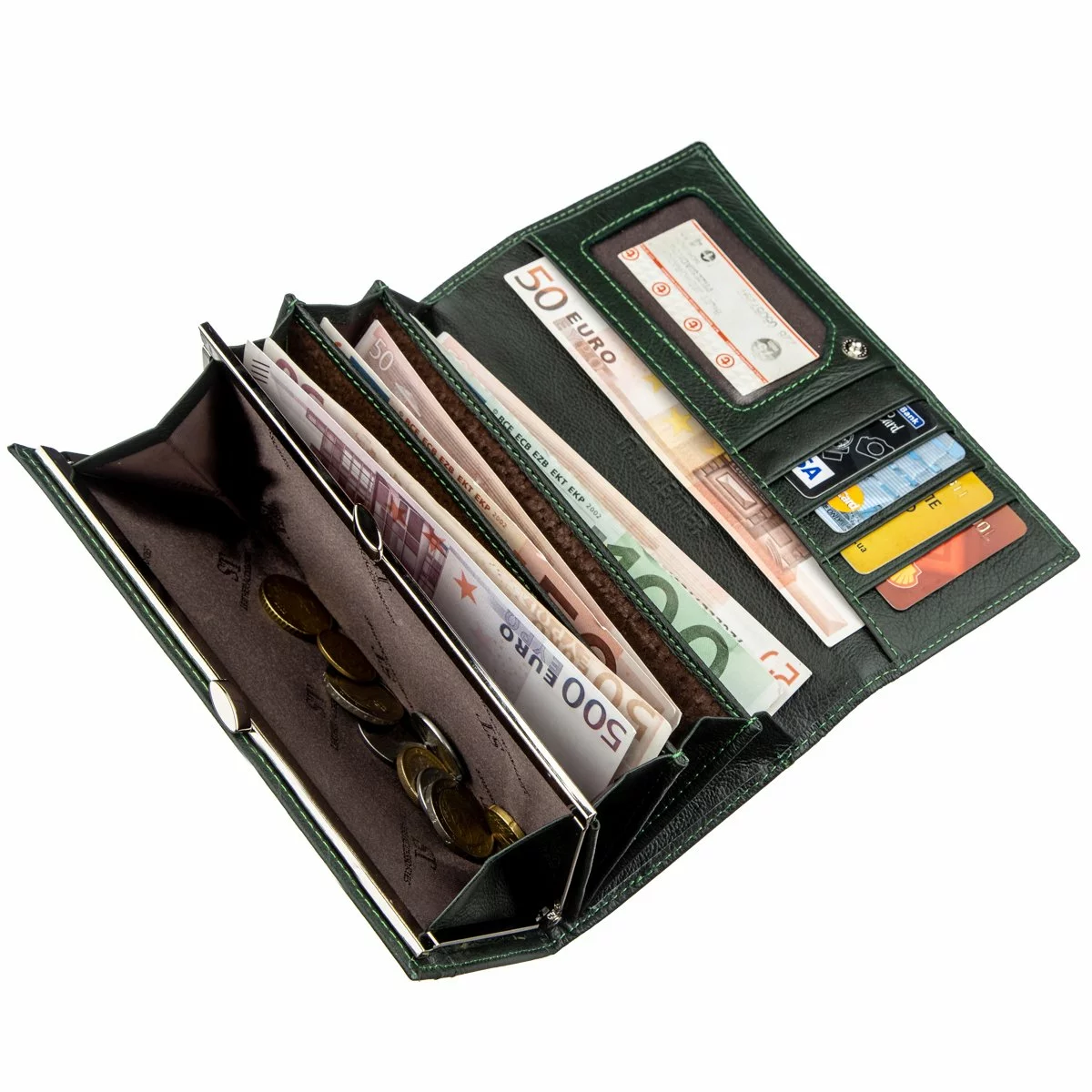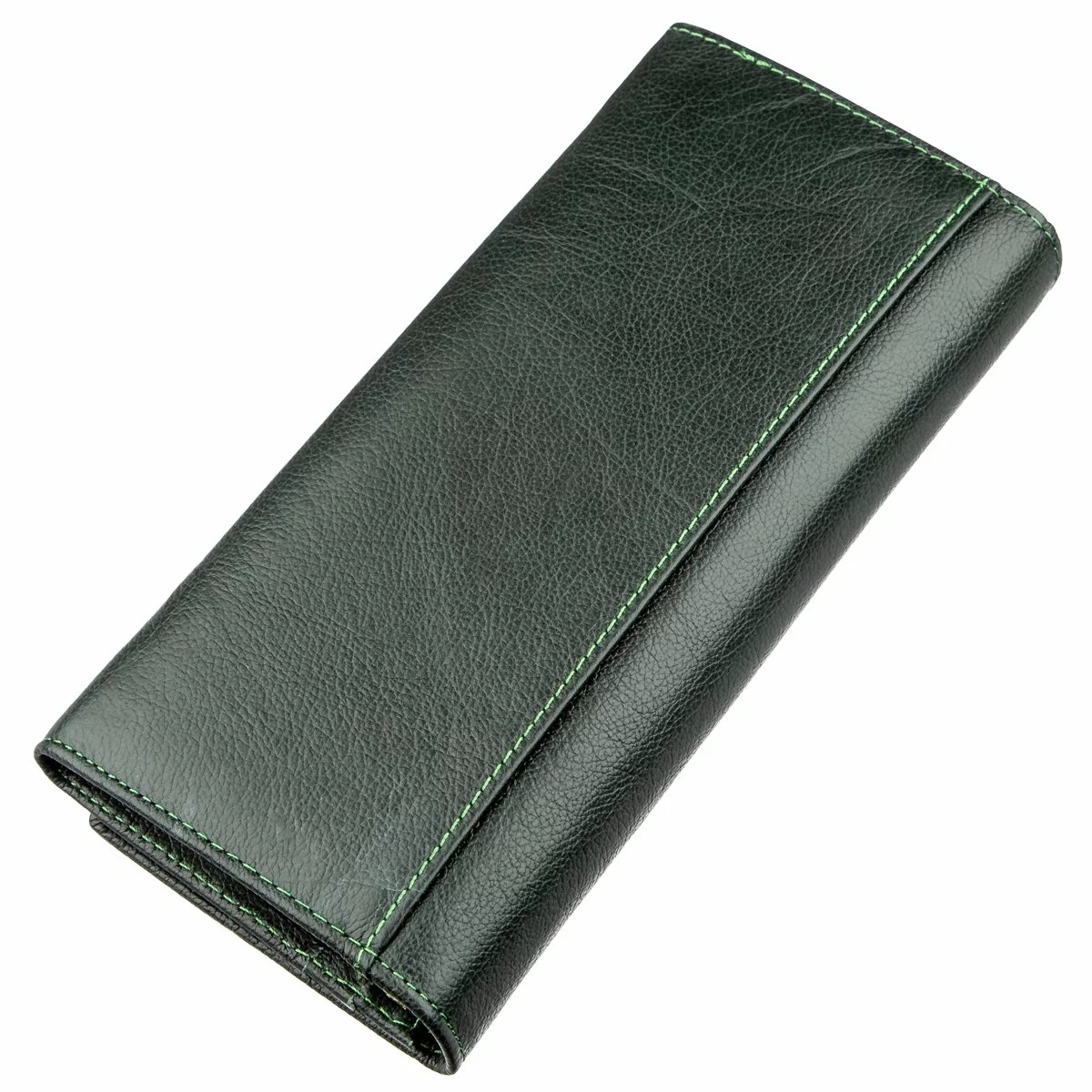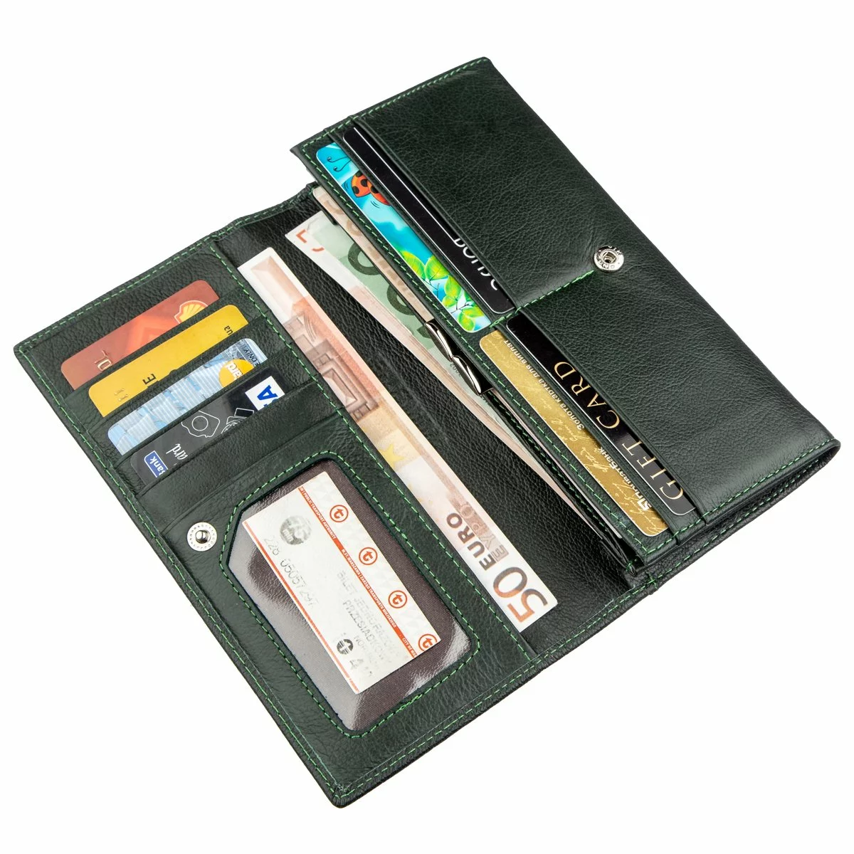 Удобный и красивый кошелек для прагматичных женщин, которые ценят в первую очередь практичность изделия. Выполнен из первоклассной натуральной кожи с прекрасными эксплуатационными характеристиками и свойствами. Цвет – темно-зеленый, неброский, но в то же время оригинальный. Все свои банкноты, монеты, пластиковые карточки и различные визитки Вы сможете расположить во вместительных и больших отделениях и карманах. Закрывается кошелек на металлическую кнопку. Данный аксессуар станет неповторимым подарком даже для самых требовательных женщин. Упаковка кошелька представлена в виде плотной картонной коробки белого цвета с фирменным логотипом.