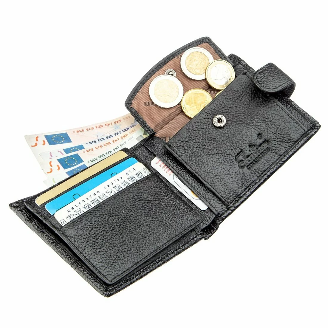 функционал в кошельке: отделения для купюр, монетник на кнопке,