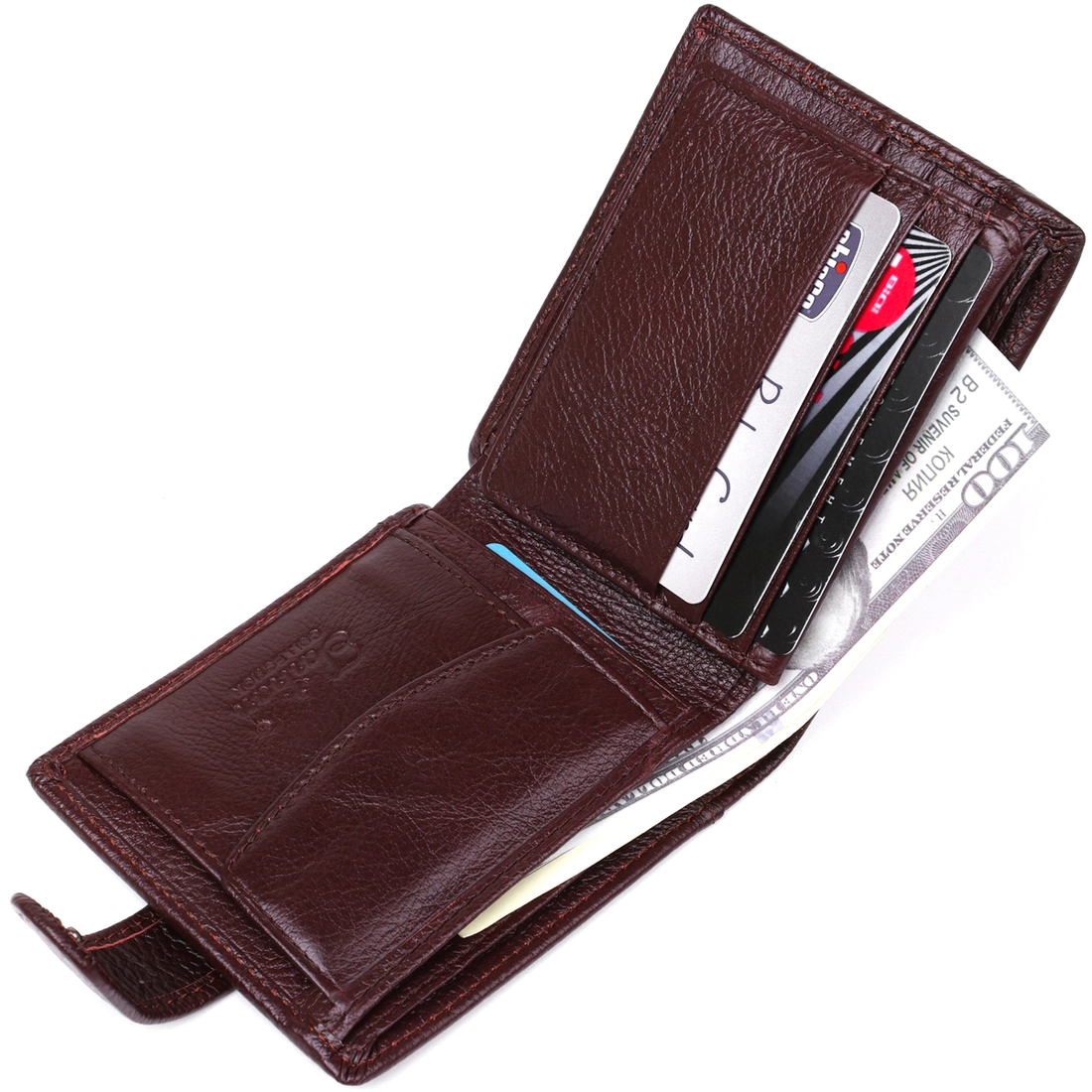 отделения для купюр, слоты для карточек, монетница. Закрывается
