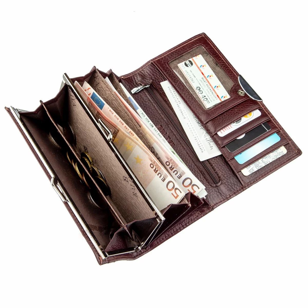 отделениями для купюр, ячейками для карточек и карманом на молнии.