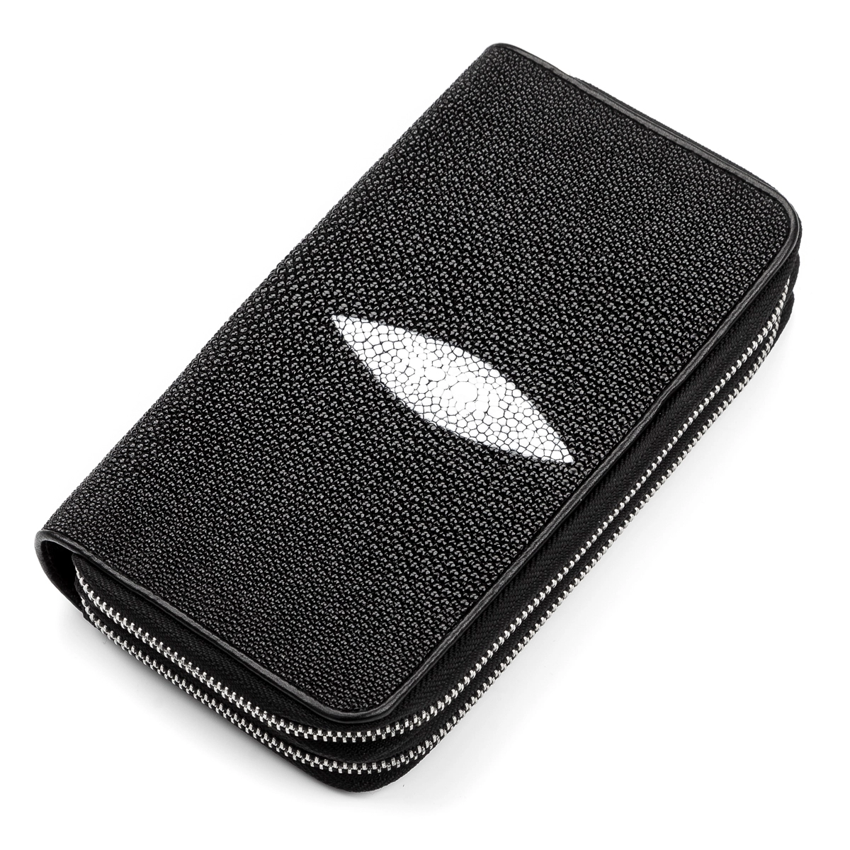 Вместительный кошелек из натуральной кожи морского ската, очень стойкой к износу, проколам, порезам, к разрывам и даже к огню. Аксессуар обшит гладкой кожей под цвет изделия. На лицевой поверхности кошелька, в виде украшения изделия расположен рисунок, белый глазок с более крупными бусинами. Изделия из кожи ската прослужат долгие годы, не теряя своего первоначального вида. Если Вы хотите приятно удивить близкого человека – подарите ему изделие из кожи морского ската.
