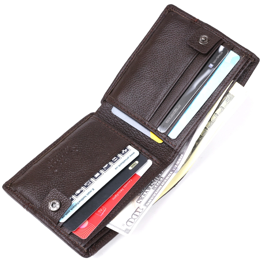 Классический кошелек из натуральной кожи темно-коричневого цвета. Аксессуар выполнен в зернистой коже. Мягкий и приятный на ощупь и дополнен всем необходимым функционалом. Аксессуар закрывается на кнопку. На внешней стороне металлический логотип бренда. Внутри кошелек дополнен просторными отделениями для купюр, слотами для карточек и отделение для купюр на молнии. Портмоне закрывается на хлястик с кнопкой.  Легко поместится в небольшую сумку или карман брюк. В комплекте идет картонная желтая коробка.