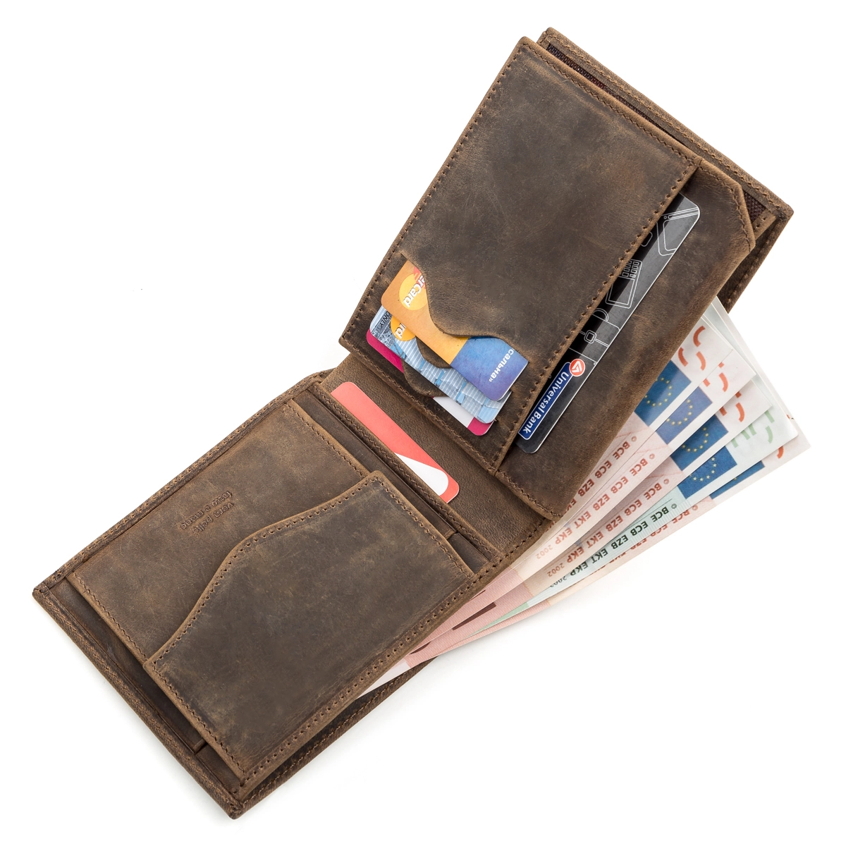 Отличный мужской кошелек, из винтажной кожи, для которой характерны потертости и неоднородность окраса. Из-за этого изделия из такой кожи дольше держат презентабельный внешний вид. Такой кожаный кошелек шикарно ложиться в руку, невероятно функционален и практичен в использовании, отлично подчеркнет стиль и статус своего владельца.