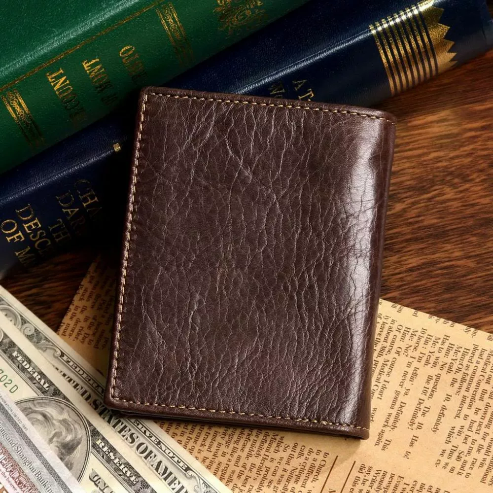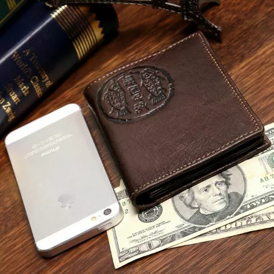 Стильное мужское портмоне вертикального формата. Аксессуар выполнен из натуральной кожи приятной на ощупь. Кошелек прошит прочной нитью светло-коричневого цвета. Швы ровные, аккуратные. Лицевая сторона изделия украшена декоративным теснение. Кошелек упакован в текстильный пылезащитный мешочек белого цвета.