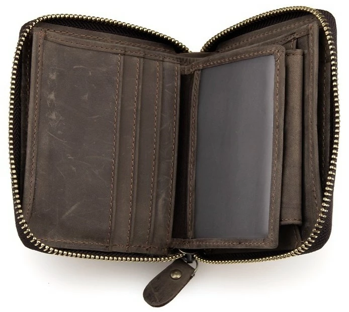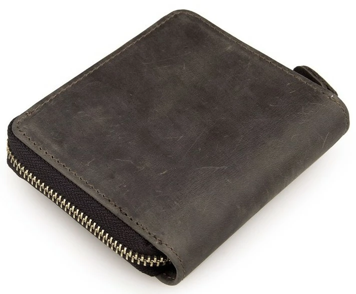 Великолепный кошелек из высококачественной винтажной кожи. Бумажник имеет весьма компактные размеры, но не смотря на это он достаточно вместителен и функционален. Аксессуар закрывается на молнию. Цвет фурнитуры: латунь. Данный купюрник может использоваться как мужчинами, так и женщинами. Кошелек упакован в текстильный пылезащитный чехол.