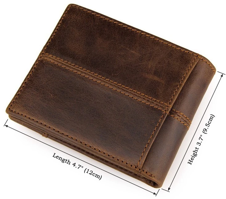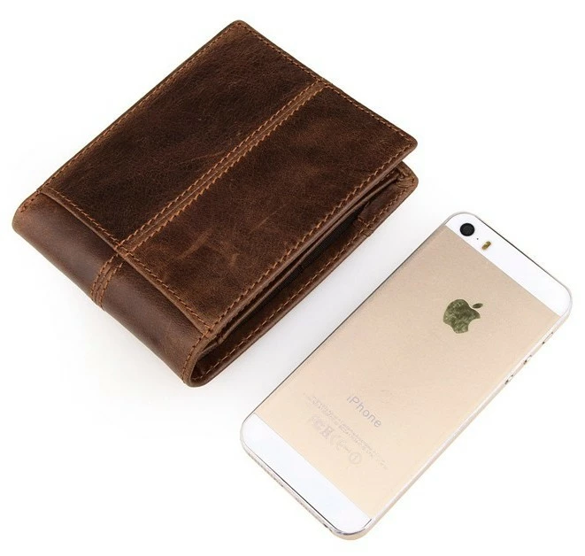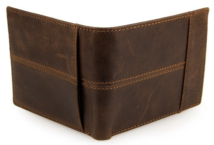 Очень качественный, удобный и стильный мужской кожаный бумажник. Кожа, из которой выполнен этот кошелек, отличается своеобразной «винтажной» фактурой. Аксессуар аккуратно прошит сверхпрочной нитью коричневого цвета. На задней внешней стороне изделия находится накладной карман для пластиковых карточек или визиток. Кошелек упакован текстильный пылезащитный чехол белого цвета.