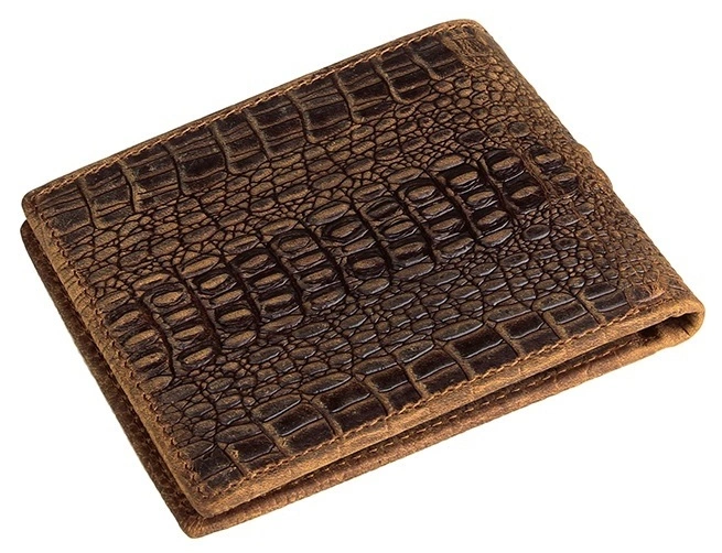 Шикарный мужской бумажник из кожи с фактурой под крокодила. Кошелек имеет компактные размеры и с легкостью помещается в карман джинсов. Аксессуар прошит сверхпрочной нитью светло-коричневого цвета. Данная модель поставляется в текстильном пылезащитном чехле.