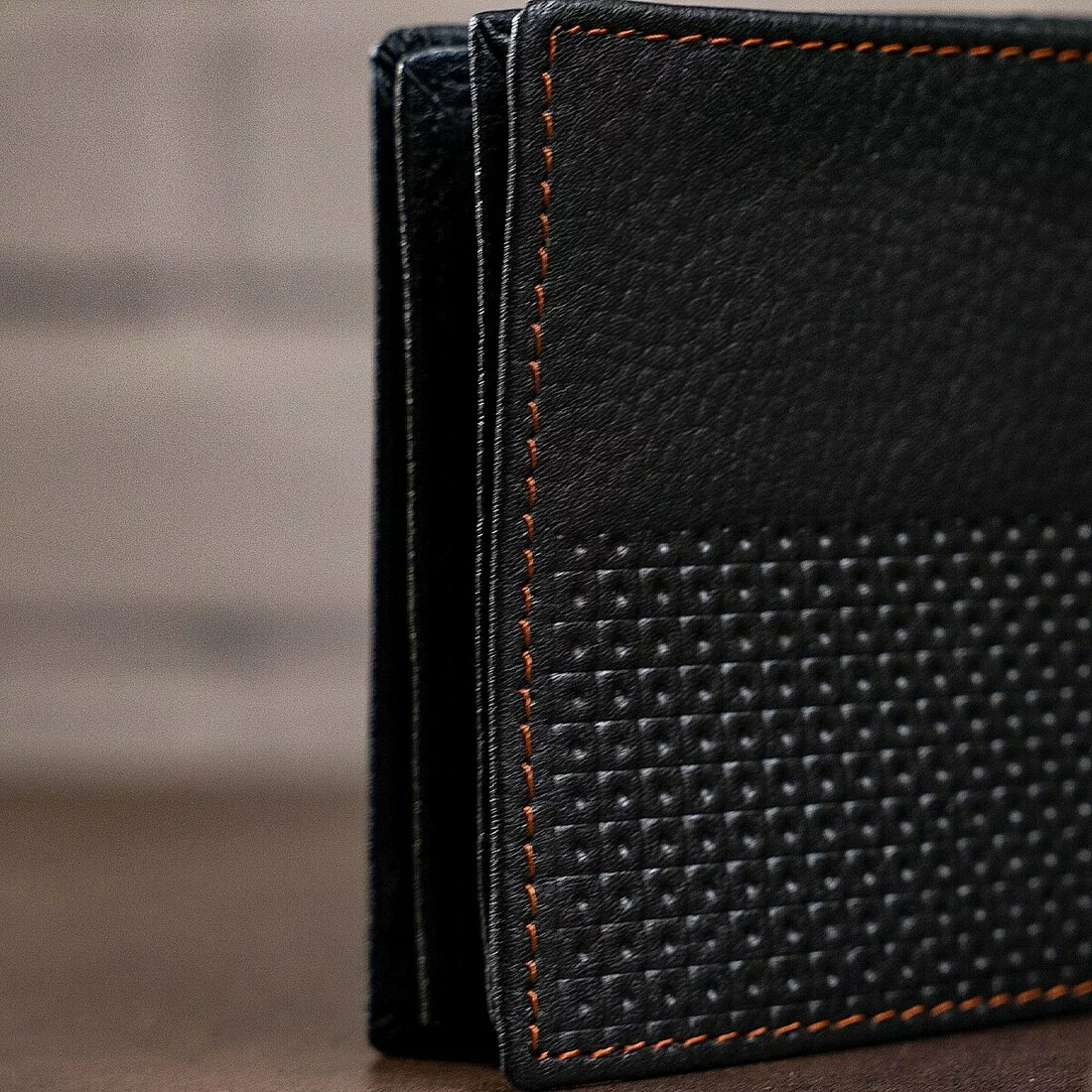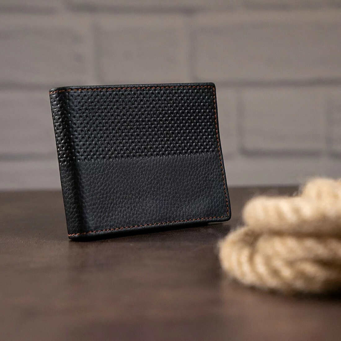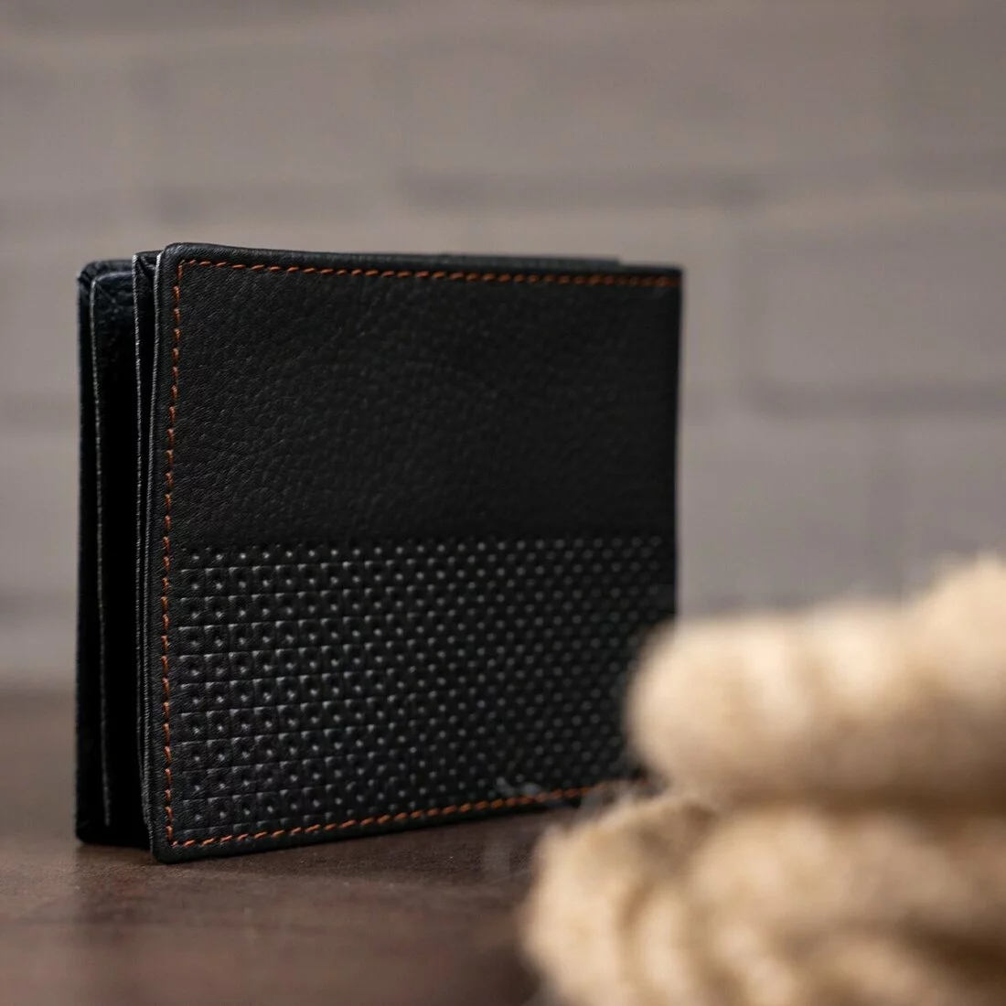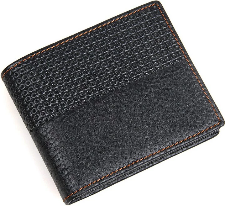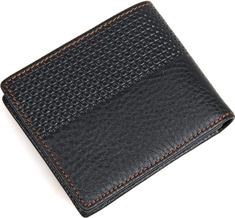 Мужской кожаный бумажник черного цвета. Имеет необычный внешний дизайн, что придает ему индивидуальность рода кошельков. Данная модель прошита нитью светло-коричневого цвета. Кошелек имеет мягкую кожу на нижней стенке и более твердую кожу на верхней стенке, благодаря кружевному теснению. Кошелек упакован в текстильный пылезащитный чехол белого цвета.