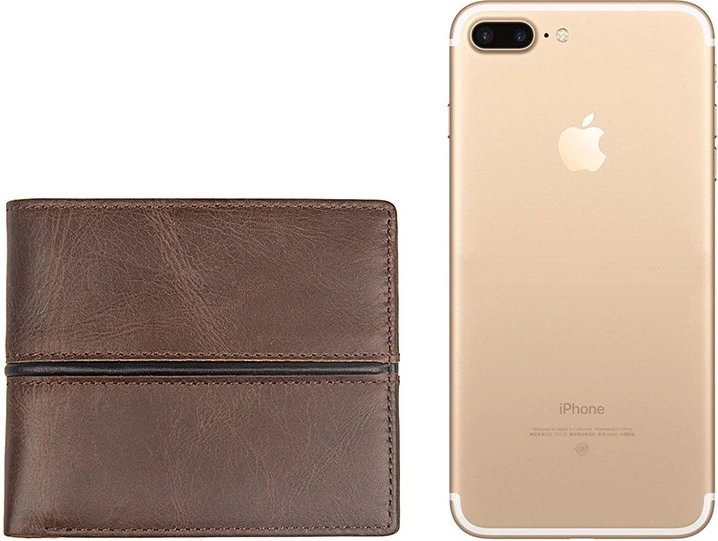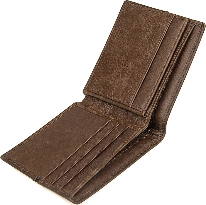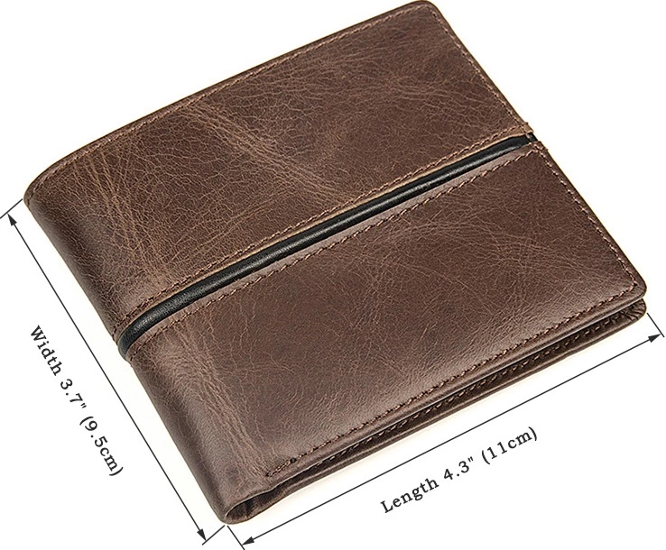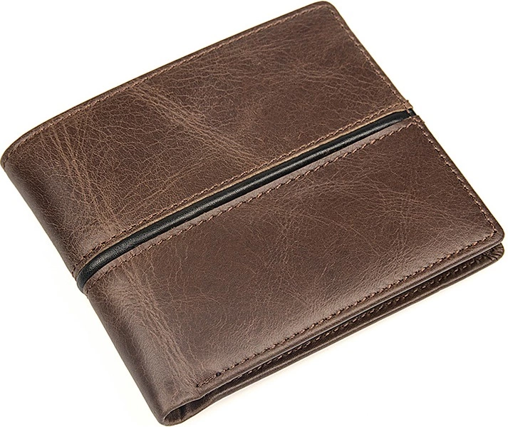 Оригинальный мужской кожаный бумажник коричневого цвета, с горизонтальной черной, кожаной вставкой посередине. Кошелек надежно прошит светло-коричневой нитью. Аксессуар удобно держать в руке, а также он легко может поместиться в передний или задний карман брюк. Отлично подойдет в качестве подарка. Кошелек упакован в текстильный пылезащитный мешочек белого цвета.