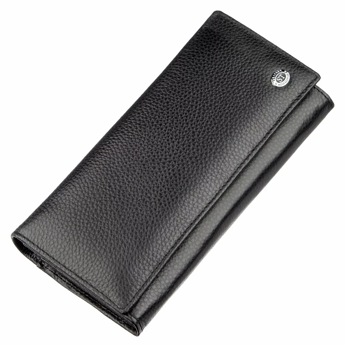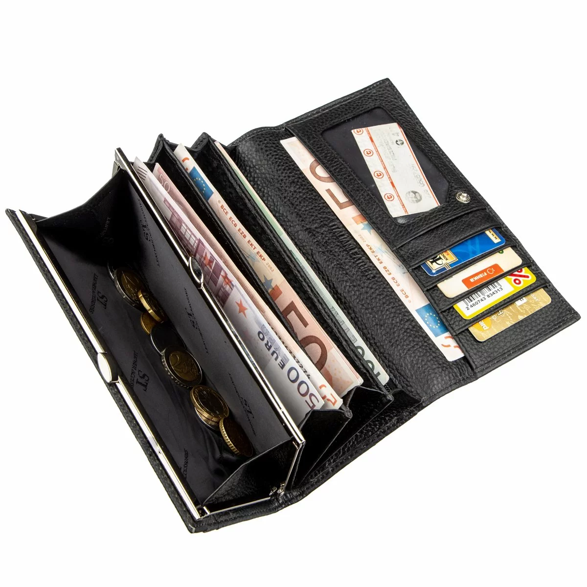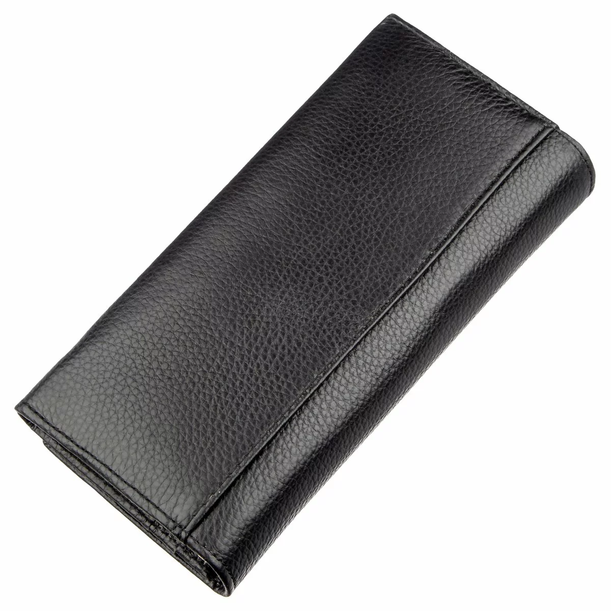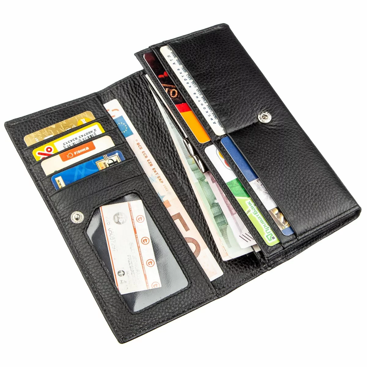 Превосходный стильный и деловой кошелек для уверенных в себе женщин. Выполнен из первосортной натуральной кожи с мягкой и зернистой фактурой. Цвет кошелька – черный, а это придает ему особой универсальности, ведь изделие подойдет под любой женский гардероб. Внутри Вы найдете достаточно больших и вместительный отделений, в том числе и удобную монетницу на металлической защелке. Также Вас порадуют специальные карманы для пластиковых и бумажных карточек и кредиток. Данный аксессуар может стать не только Вашей неотъемлемой частью в повседневной жизни, но и сногсшибательным подарком для близкого человека или коллеги. Упакован кошелек в твердую картонную коробку.