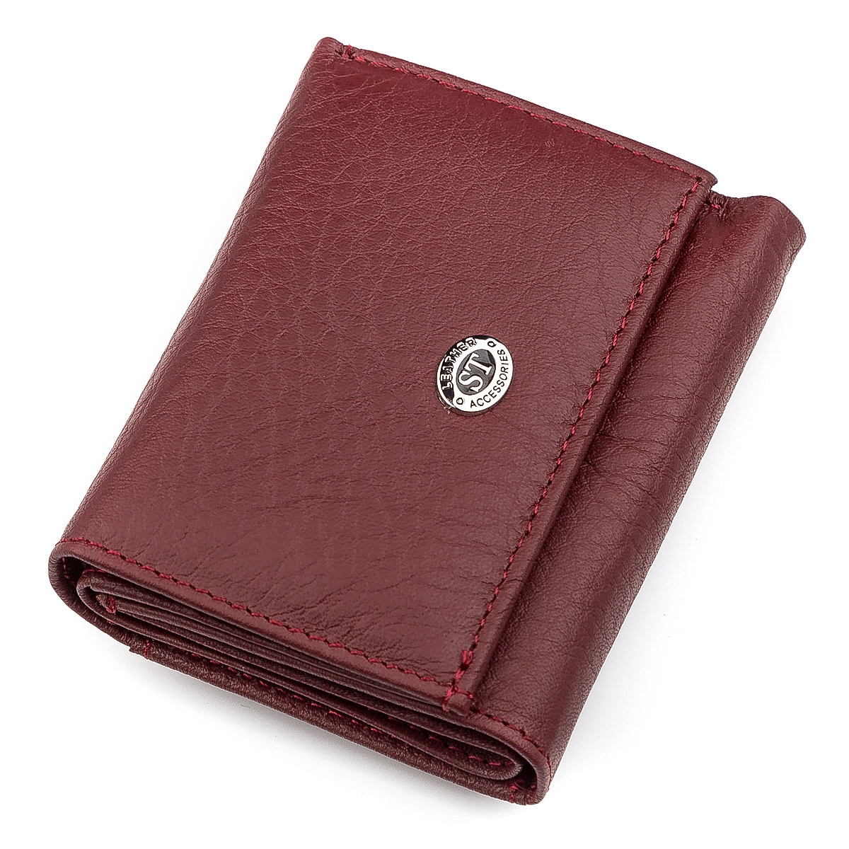 Кошелек яркого и сочного бордового цвета из натуральной фактурной кожи подойдет для каждой девушки. Модель имеет небольшие размеры, а в качестве фиксатора выступает металлическая кнопка. Снаружи можно увидеть отделение для монет. Дабы не утяжелять аксессуар, внутри расположен самый минимальный функционал: пару отделений для бумажных денег и две ячейки для пластиковых карт.