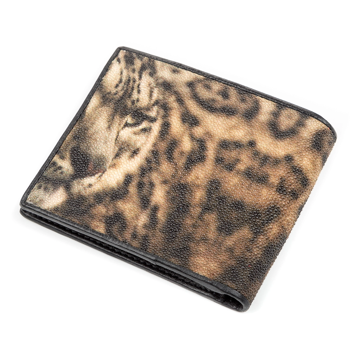 Необычный кошелек из натуральной кожи морского ската, очень стойкой к износу, проколам, порезам, к разрывам и даже к огню. Аксессуар обшит черной гладкой натуральной кожей. Все пространство кожи покрыто сотнями мелких бугорков, разного размера, которые играют на свету, как небольшие бусинки. Внешний вид аксессуара, декорированный красивым тигровым принтом. Стильный аксессуар, который прослужит очень долго и отлично подчеркнет стиль и статус своего владельца.